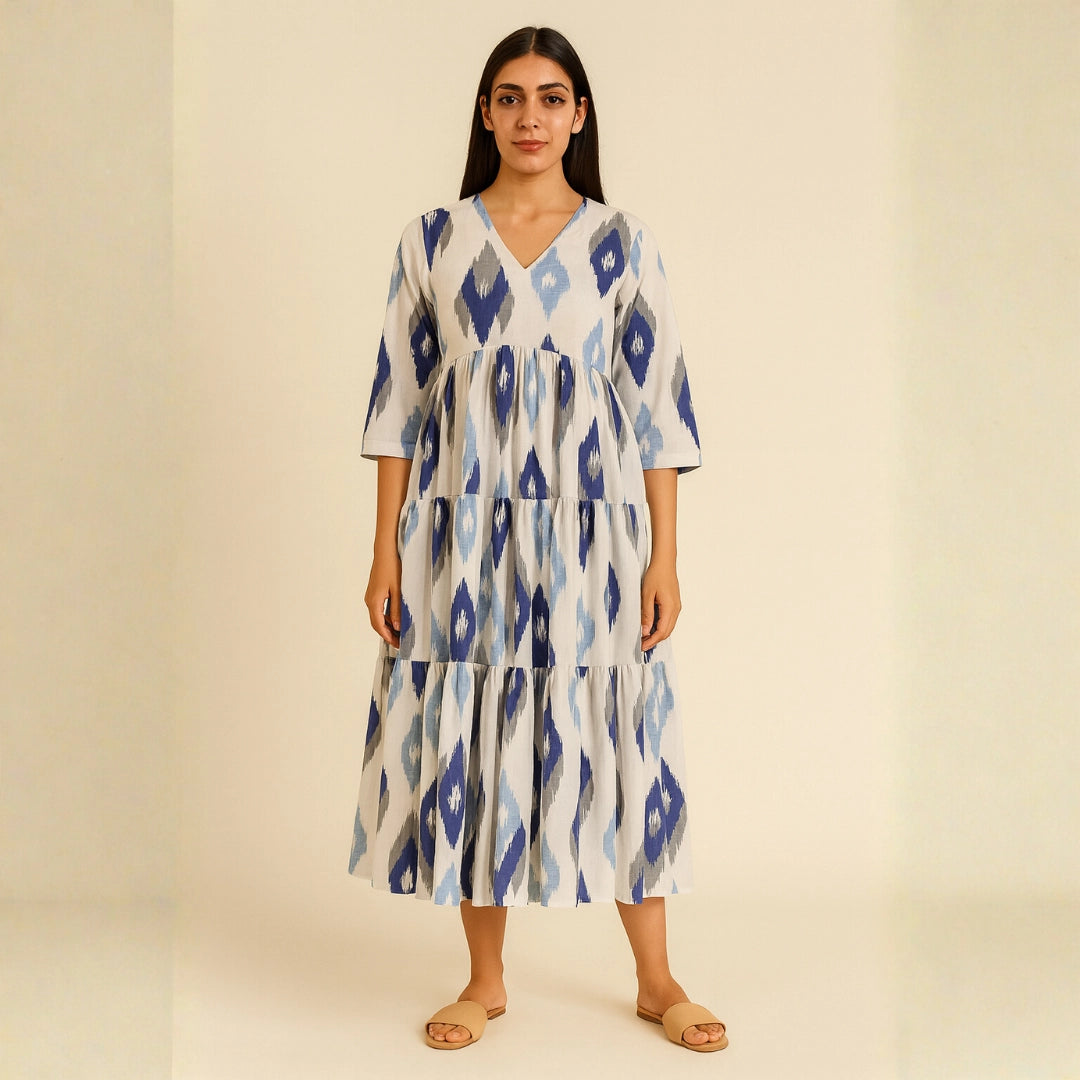 Beautiful Blue and White Ikkat Printed Dress with Matching Shirt Family Set