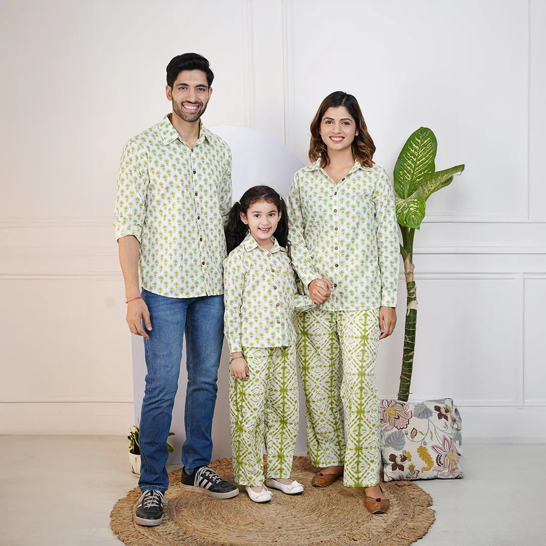 Refreshingly Stylish Green Printed Shirt with Comfy Pants And Matching Shirt Family Matching Set