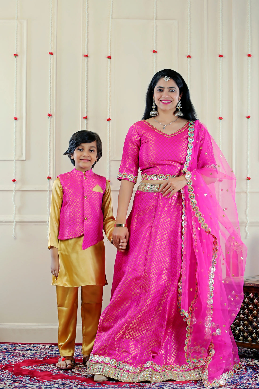 Fuschia Pink Lehenga Choli with Golden Kurta Pyjama and MAtching Pink Jacket ( Mom and Son Twin Set )