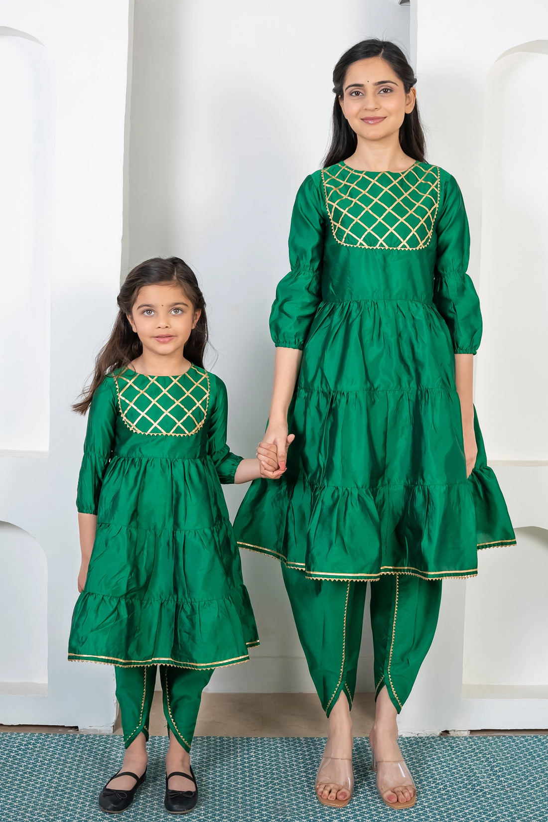 Green and Golden Tiered Kurta with Dhoti For Mom and Daughter Twin Set