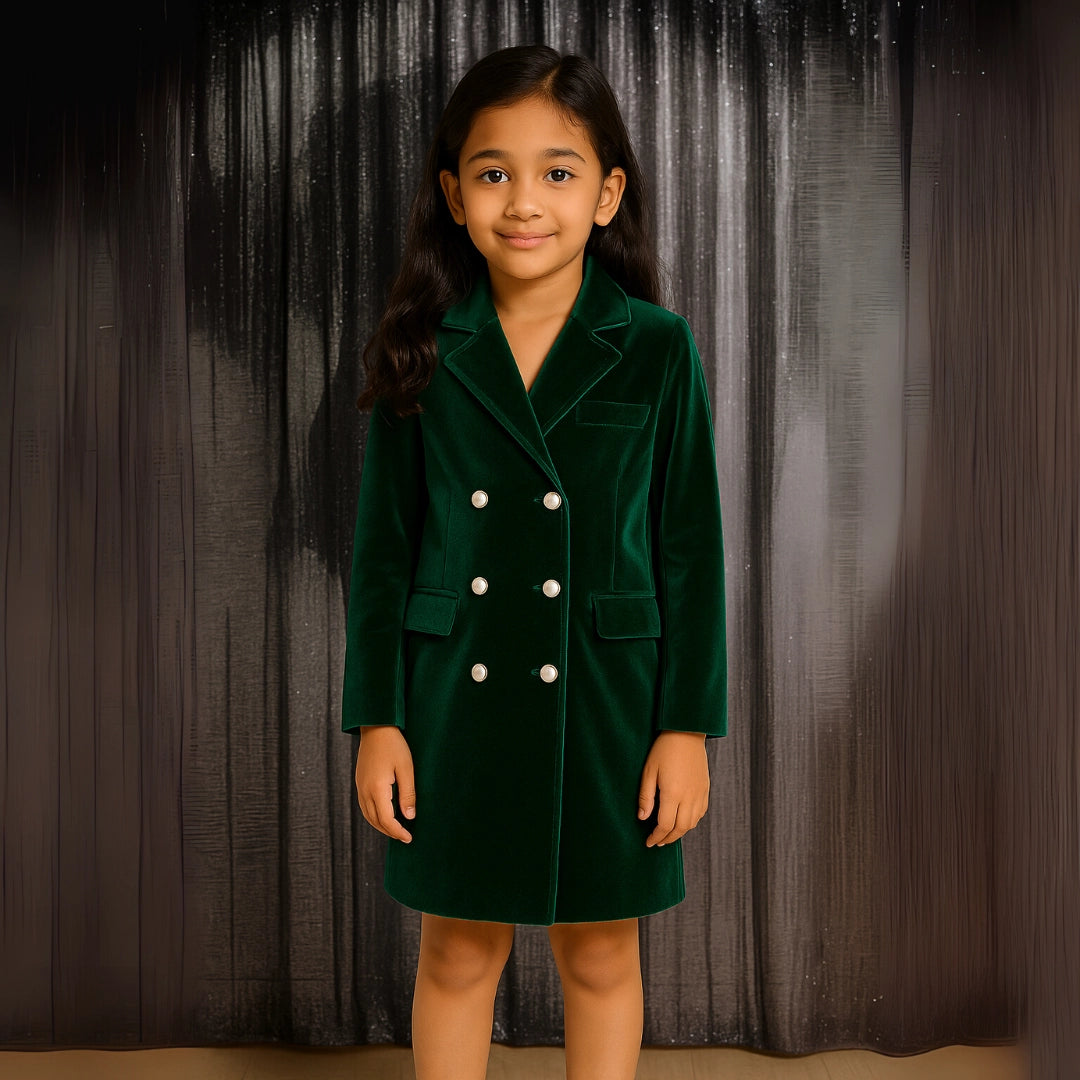 Green Velvet Double-Breasted Blazer Mini Dress For Kid
