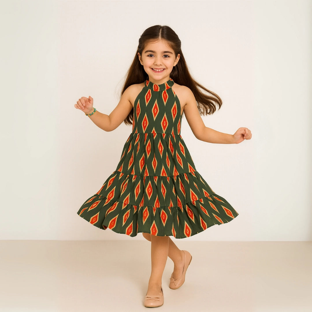 Green and Red Ikkat Halter Dress
