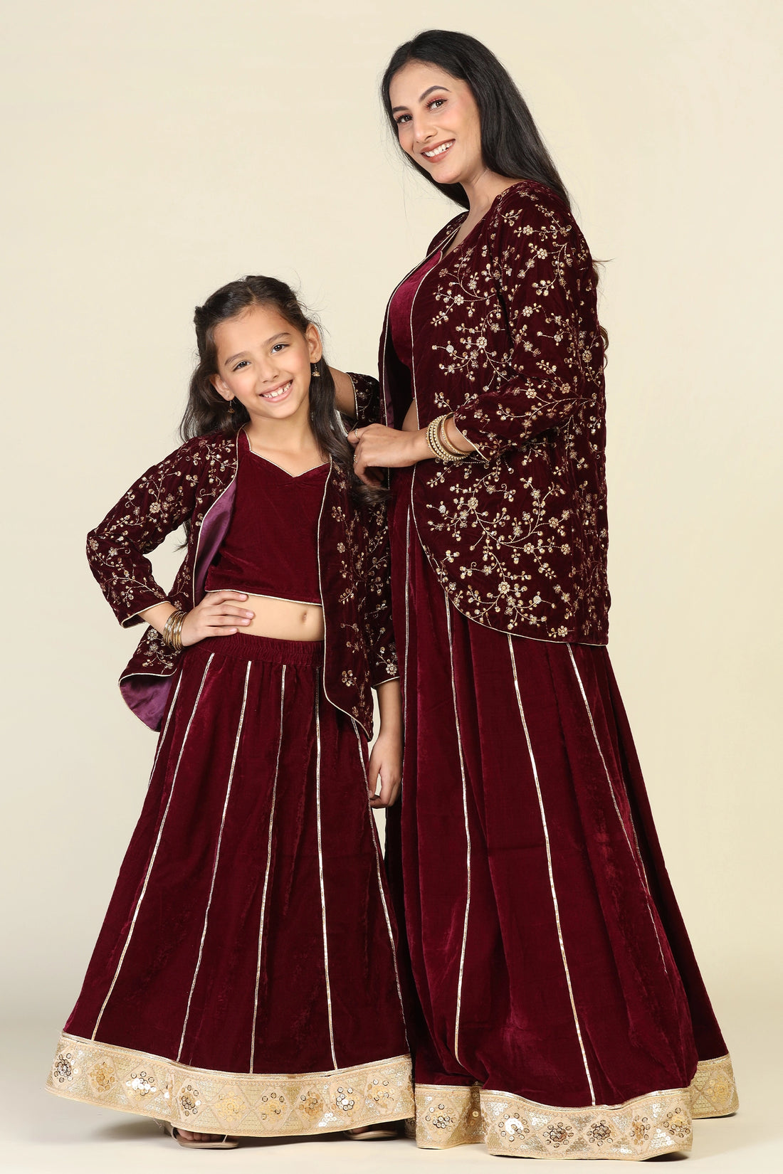 Graceful Wine-themed Zari Work Lehenga Set for Mom and Daughter