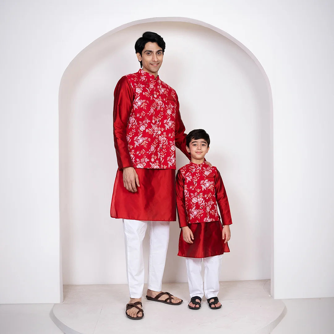 Maroon & White Floral Printed Cotton Father and Son Twin Set