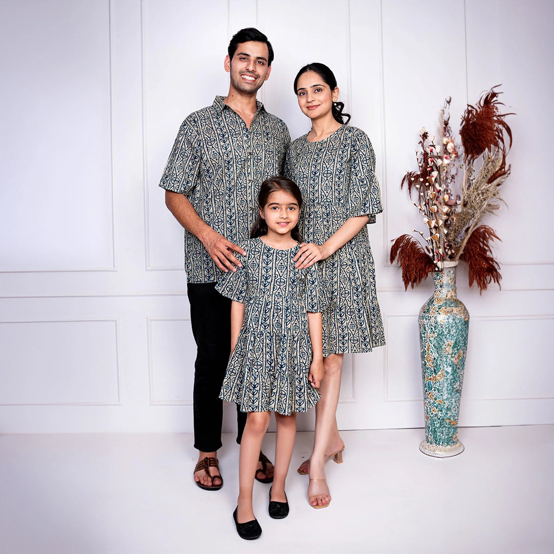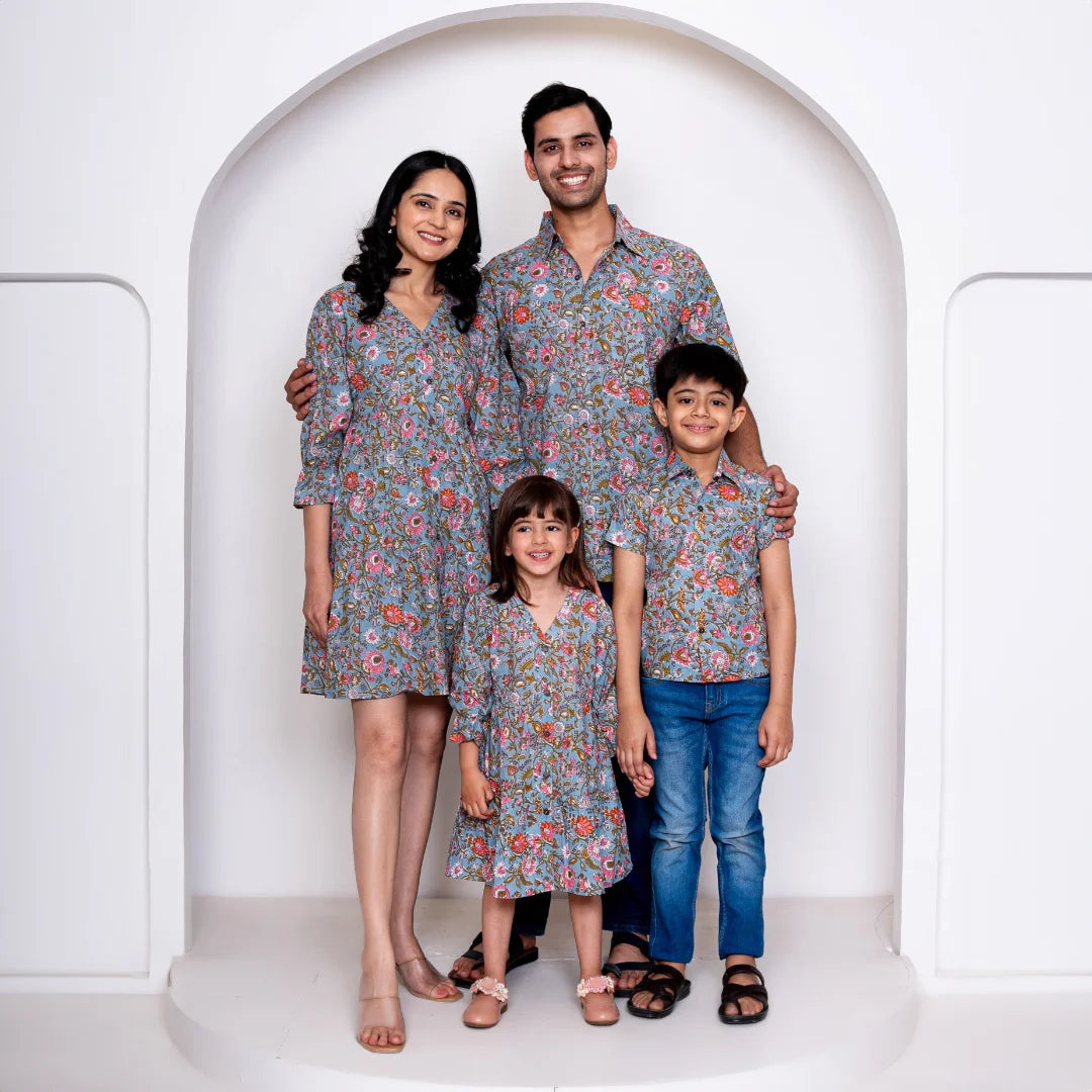 Grey & blue Printed Family Sets with Matching Dress & shirts