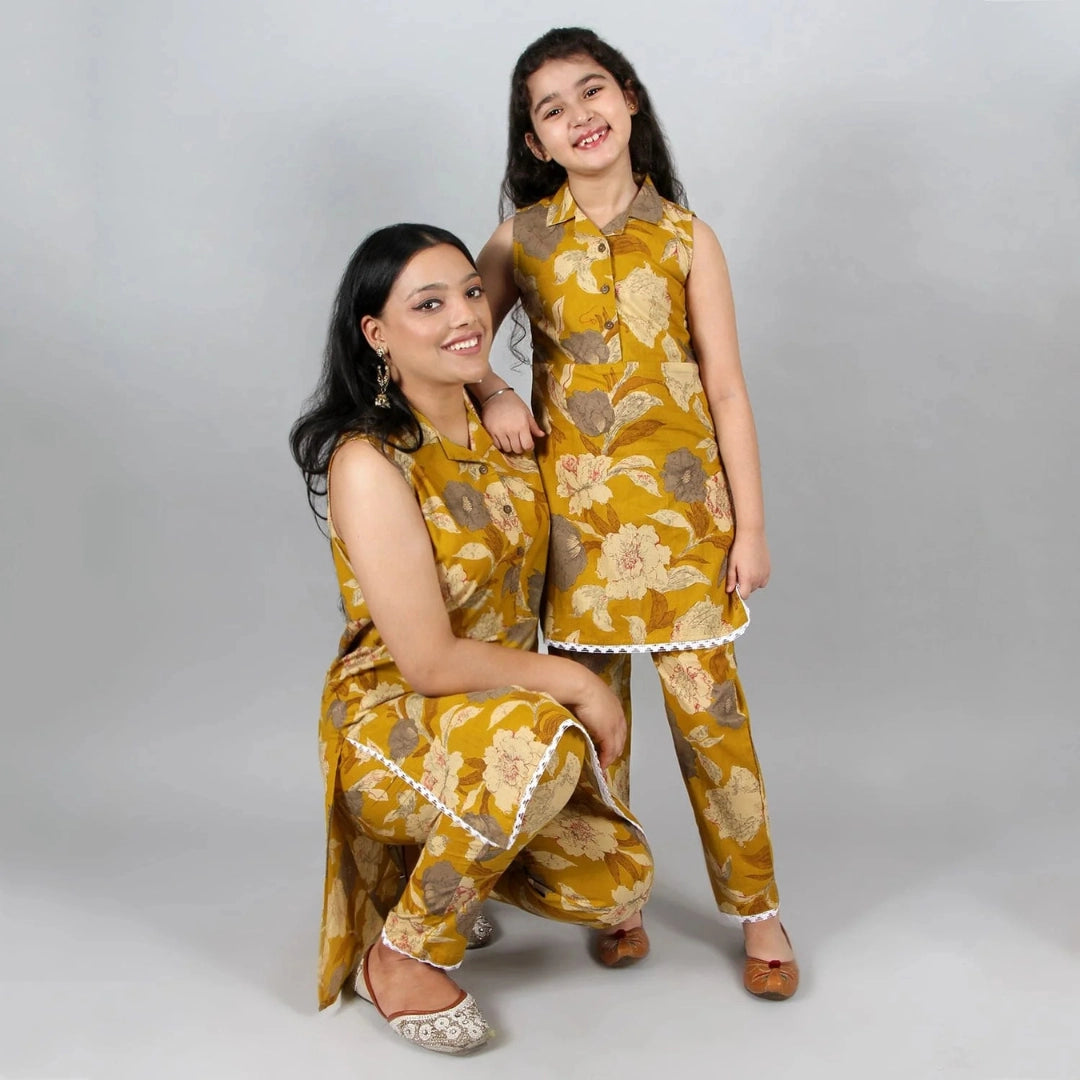 Mustard Floral Print Suit Set For Mom And Daughter