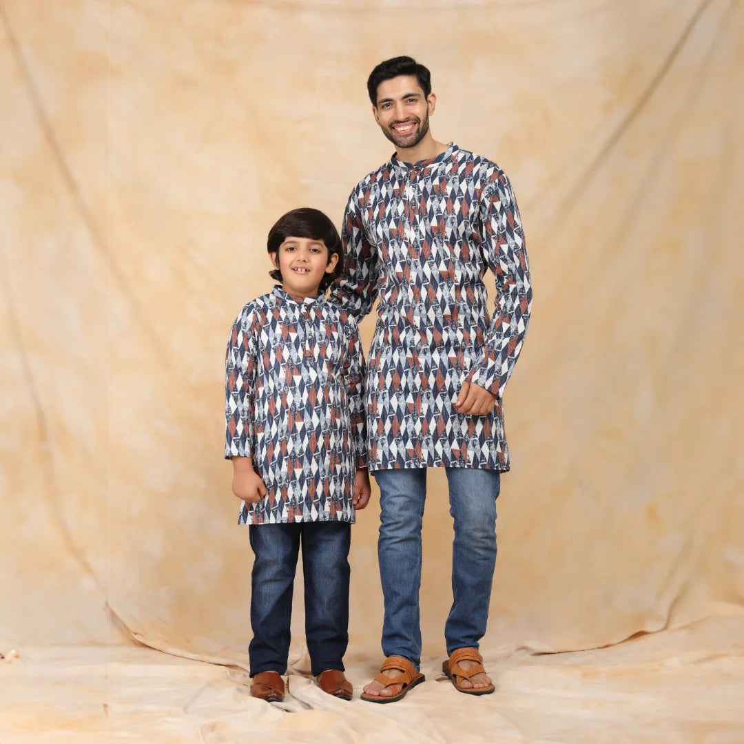 Navy Blue & White Ikkat Printed Matching Kurta Father & Son Twin Set