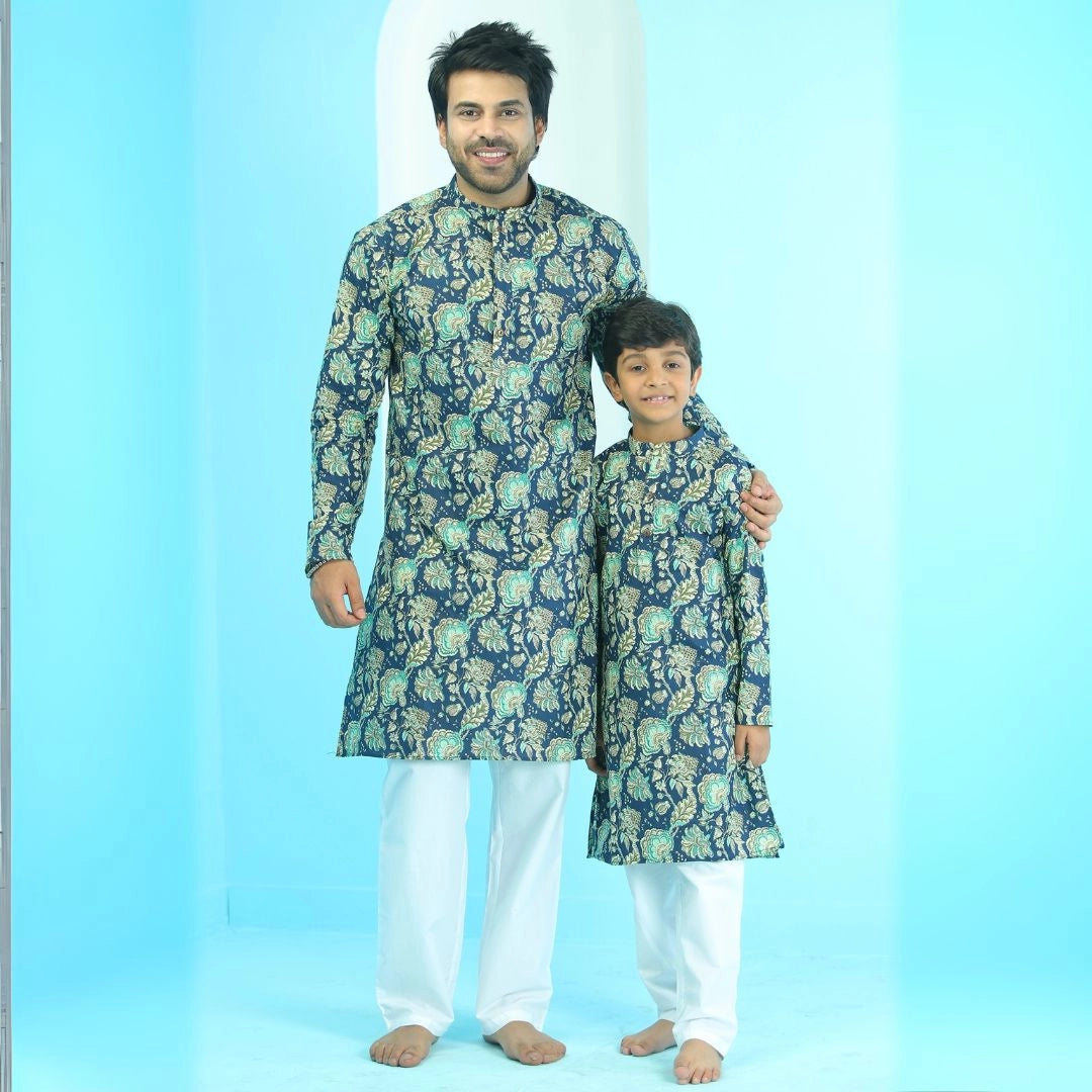 NAVY BLUE FLORAL KURTA WITH WHITE PYJAMA ( FATHER AND SON TWIN SET )