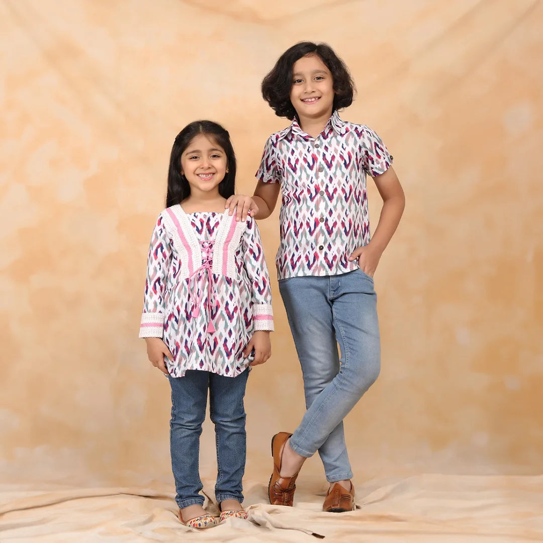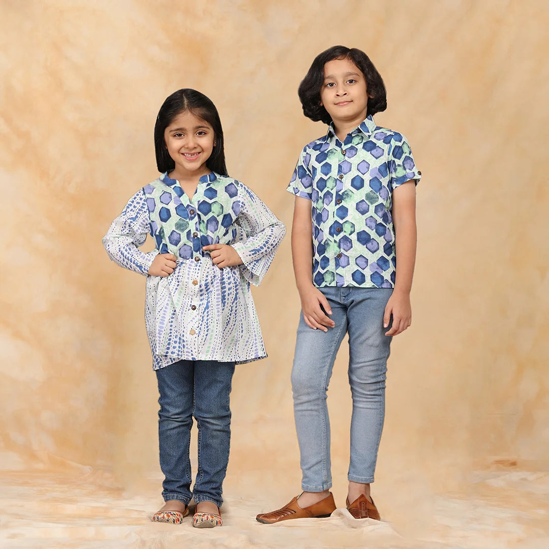 Blue and White printed Tunic with Matching Shirt Brother and Sister Twin Set