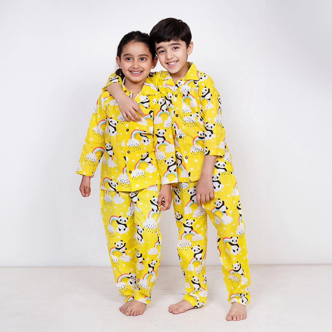 Lemony Yellow and White Floral Printed Night Suit Set For Brother and Sister
