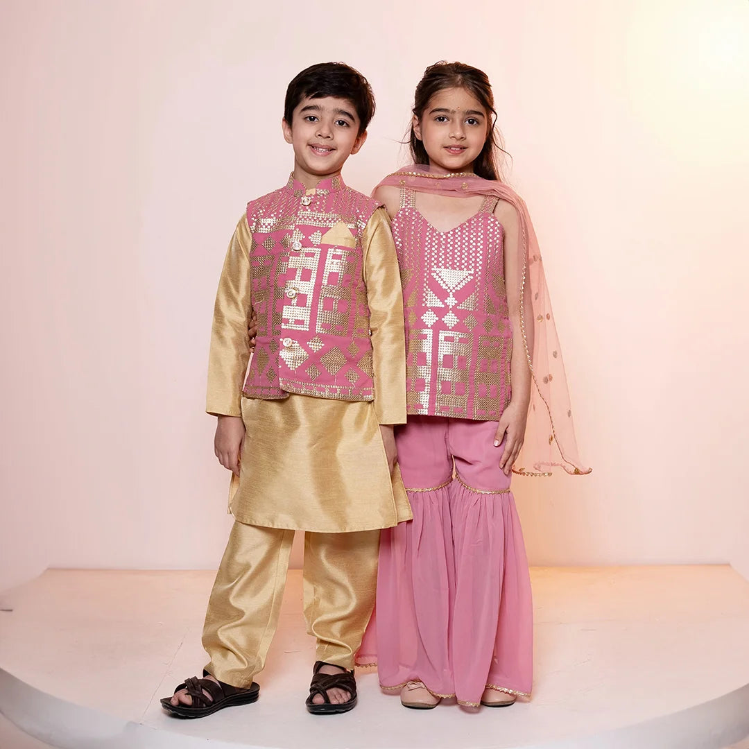 Stylish Rouge Sharara Suit with Rouge Jacket and Golden Kurta Pyjama For Brother and Sister Twin Set