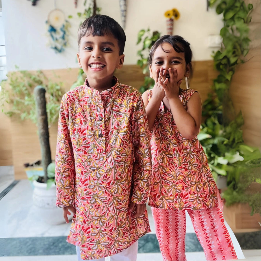 Floral Fuchsia Fiesta: Crop Top and Plazzo Perfection with Matching Kurta Pyjama Twin Set for Brother and Sister