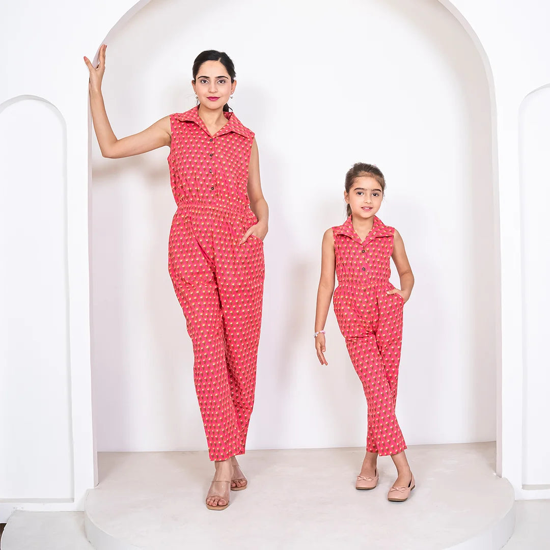 Stylish Holiday Duo: Red and Yellow Printed Cotton Jumpsuit Matching Outfits for Mom and Daughter
