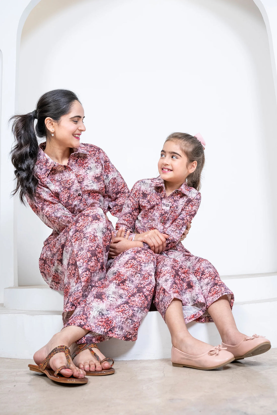 Wine Floral Pant with Shirt Co - Ord Set for Mom and Daughter