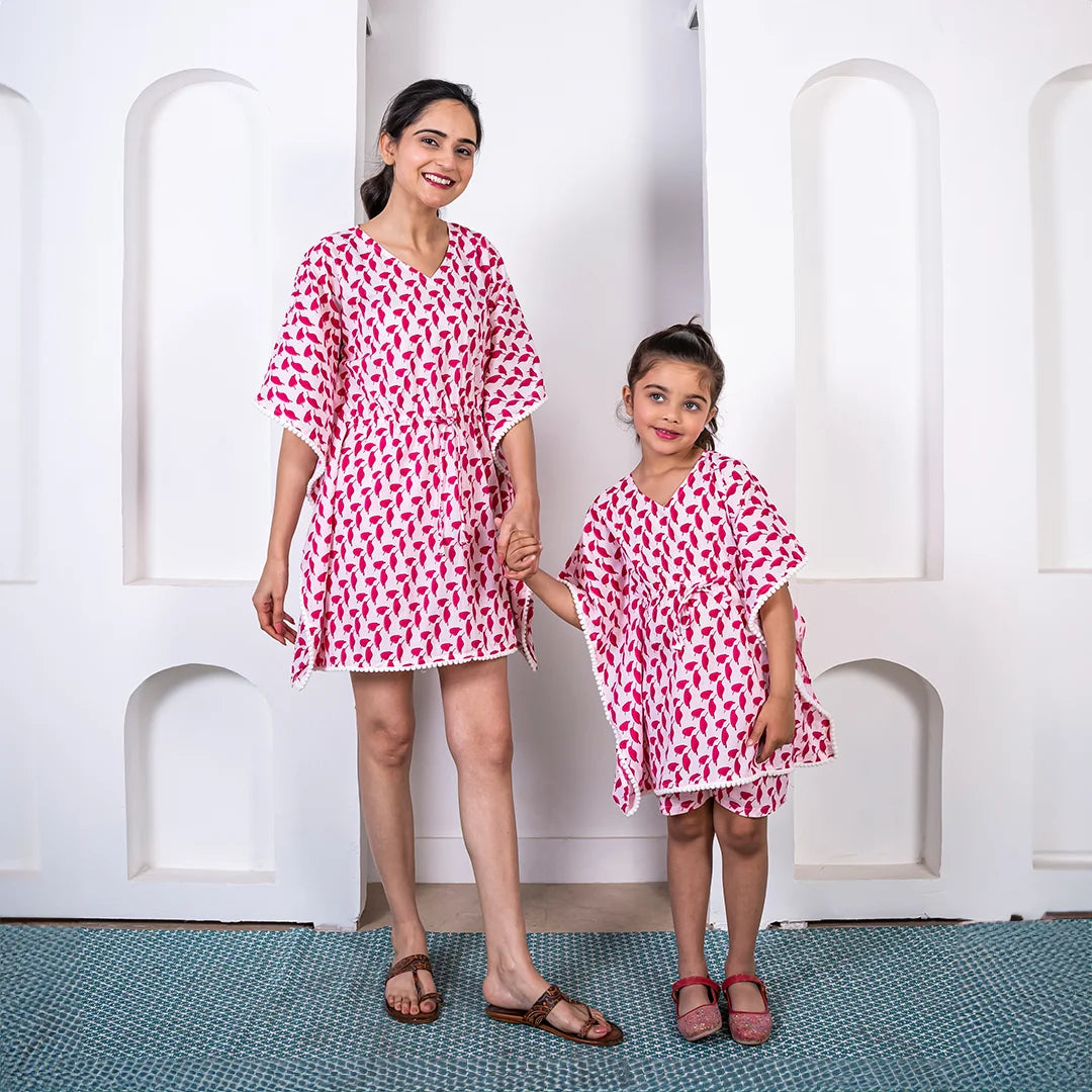 Stylish Holiday Wear: Matching Outfits for Mom and Daughter - White and Red Cotton Kaftan and Shorts Set