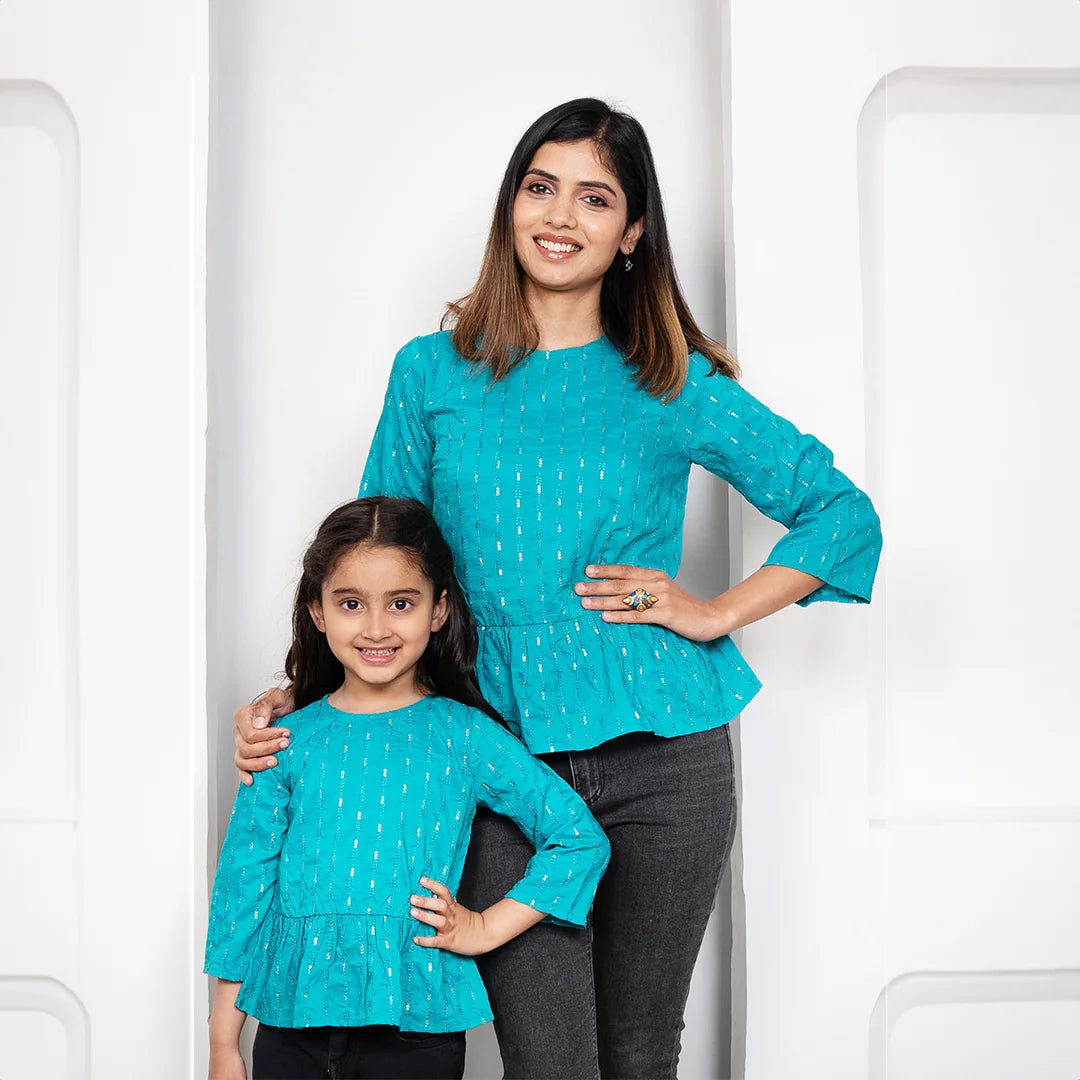 Twinning in Style: Blue & Silver Peplum Tops for Mom & Daughter