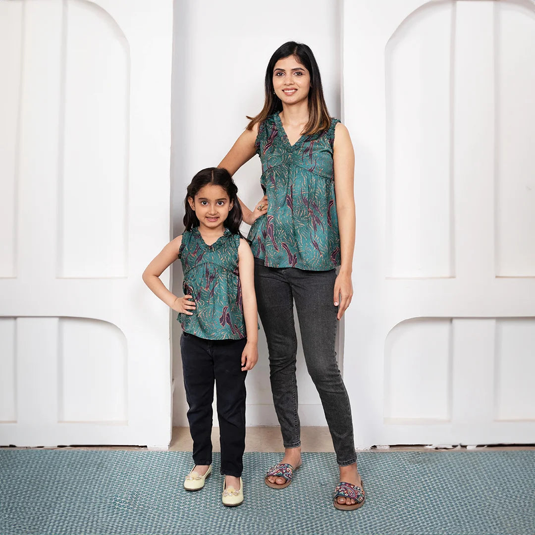 Shining Green Printed Tops For Mom and Daughter Twin Set