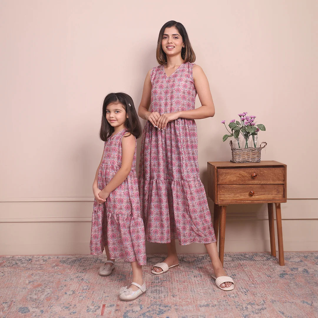 Elegant Petals: Mom and Daughter Twin Set in Baby Pink Floral Print