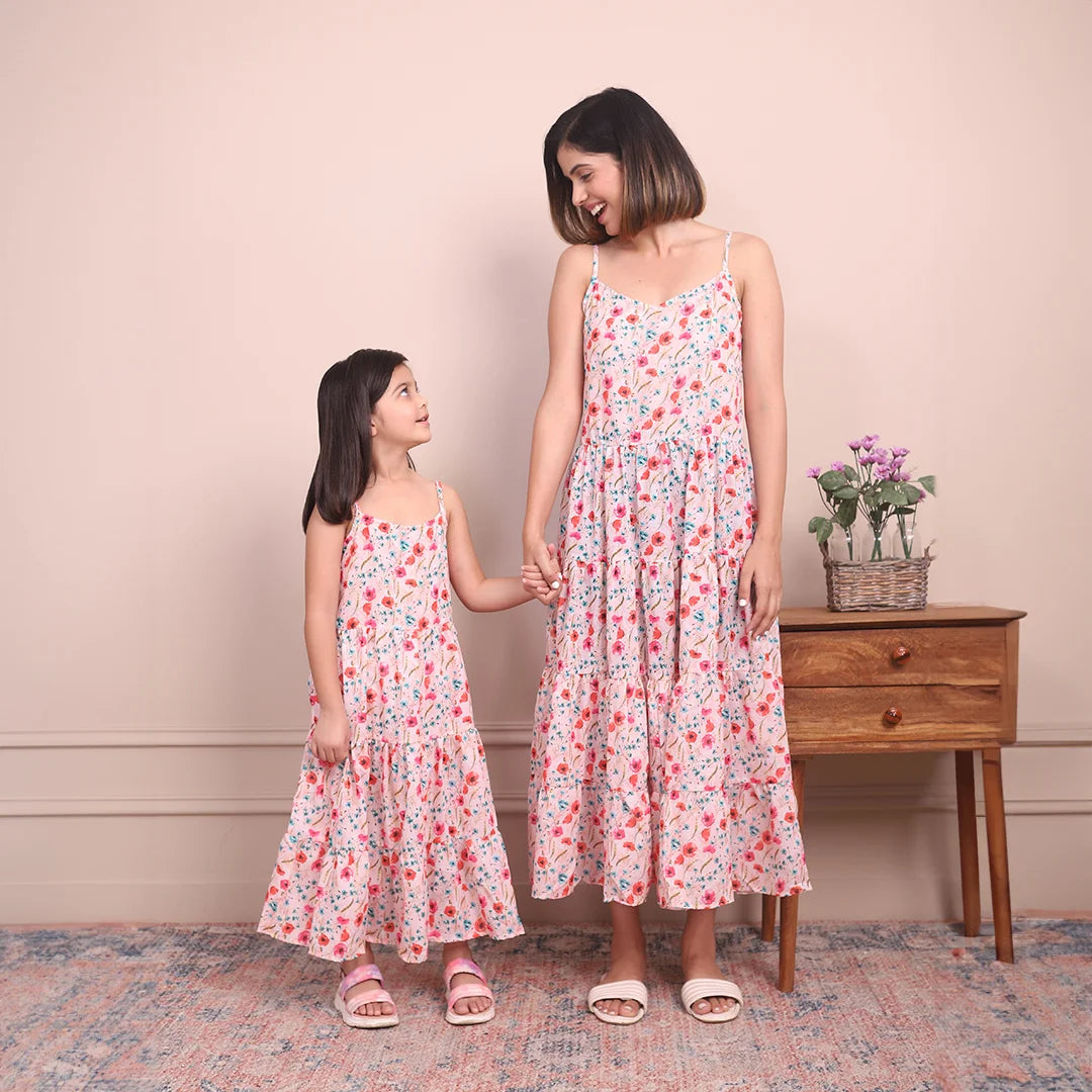 Matching Mom and Daughter Sleeveless Spaghetti Dresses in Peach Multi Floral Cotton – Casual Twin Set