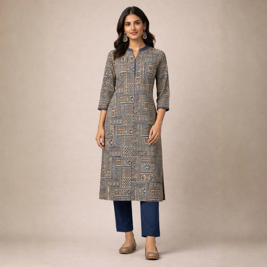 Blue Printed Straight Kurta For Women