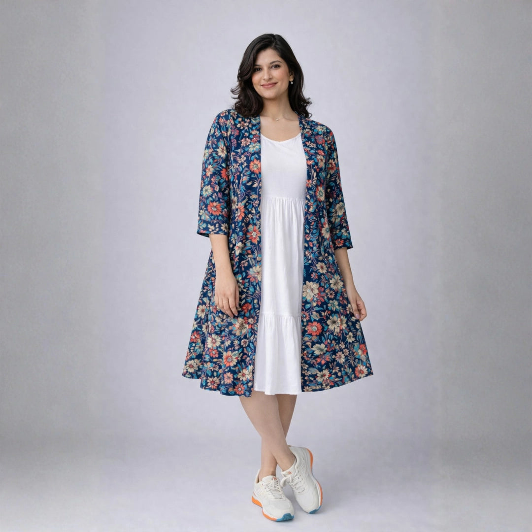 Navy Floral Shrug Dress Set For Women