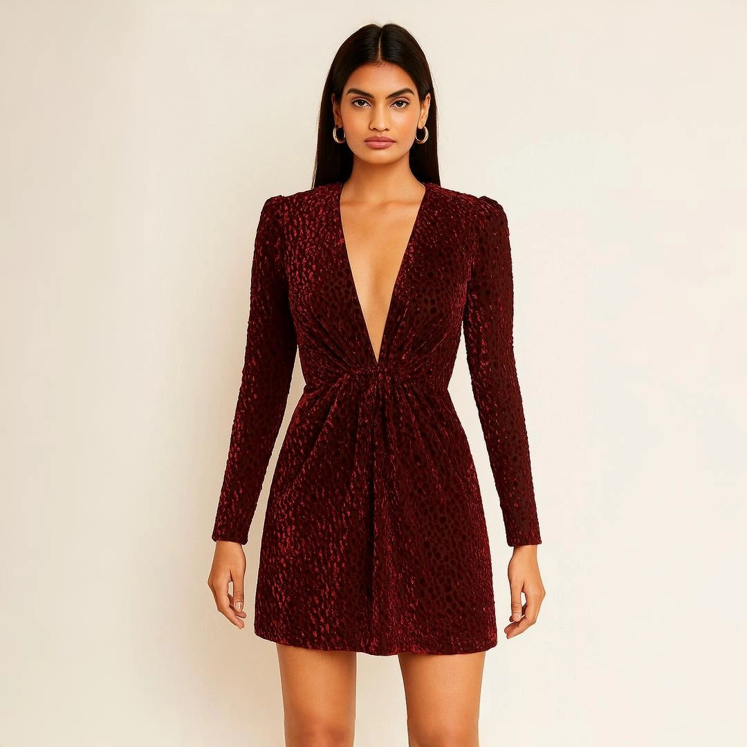 Maroon Velvet Evening Dress with Long Sleeves