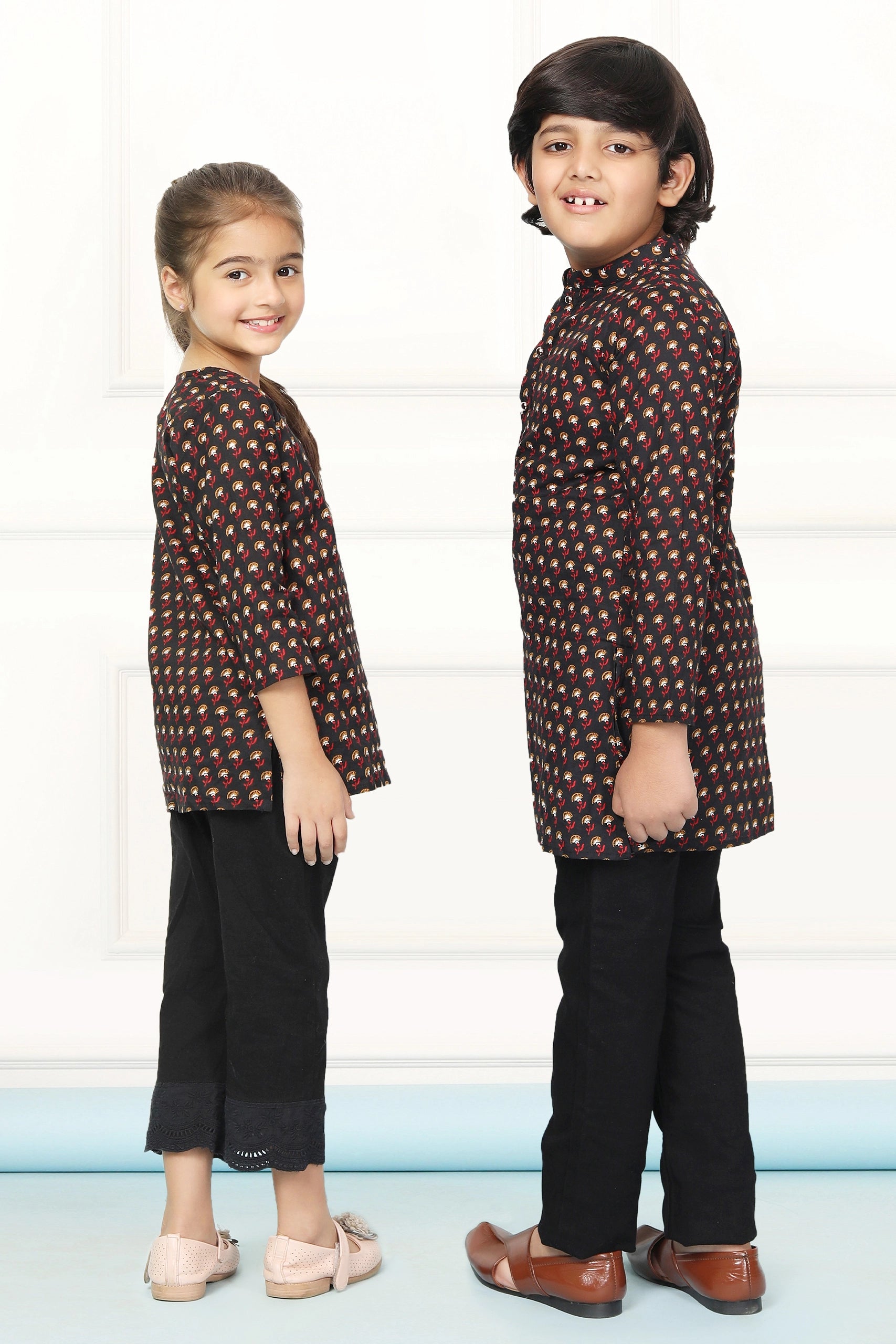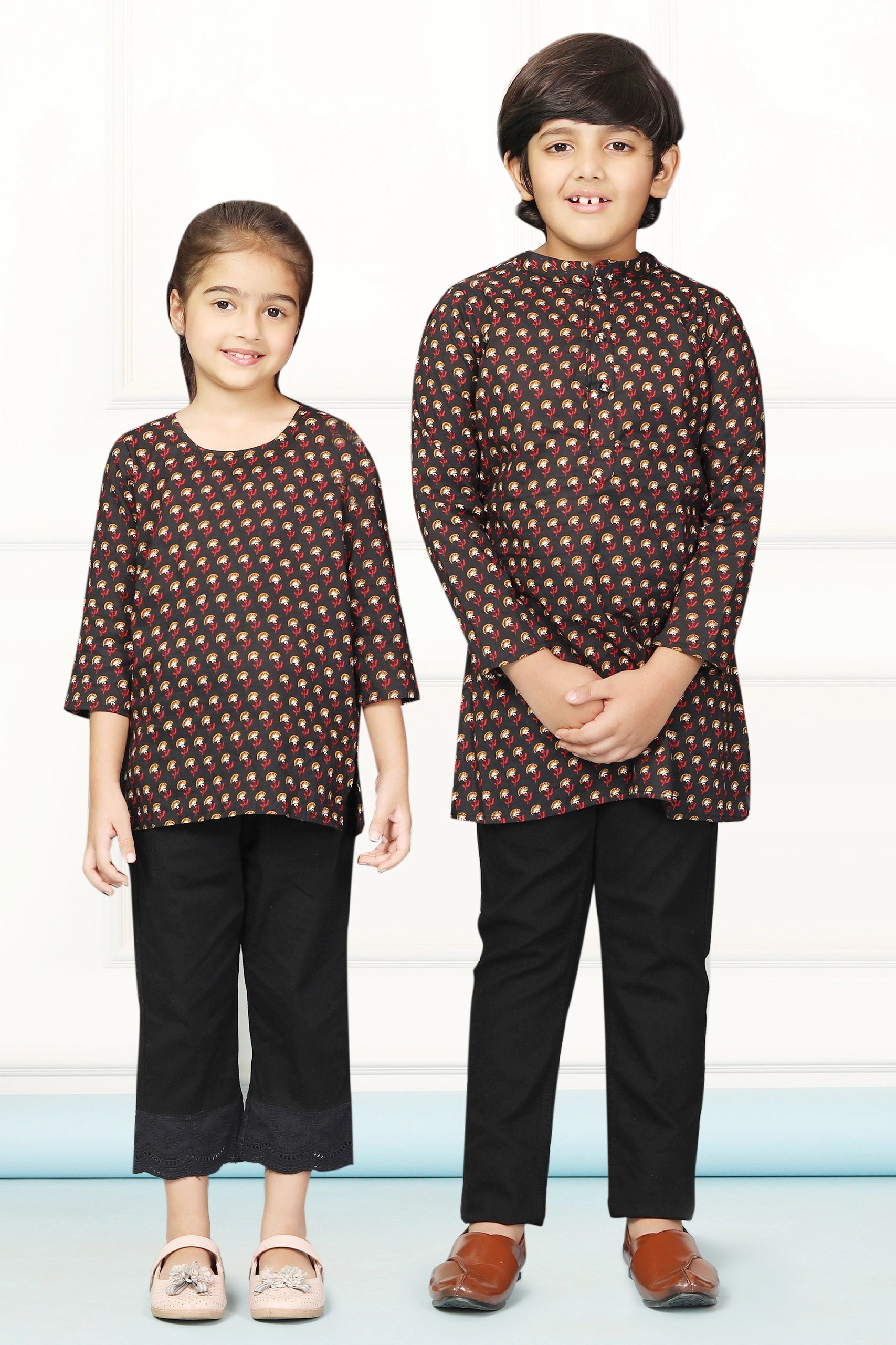 Stylish Black Printed Short Kurti & Matching Kurta Twin Set for Siblings