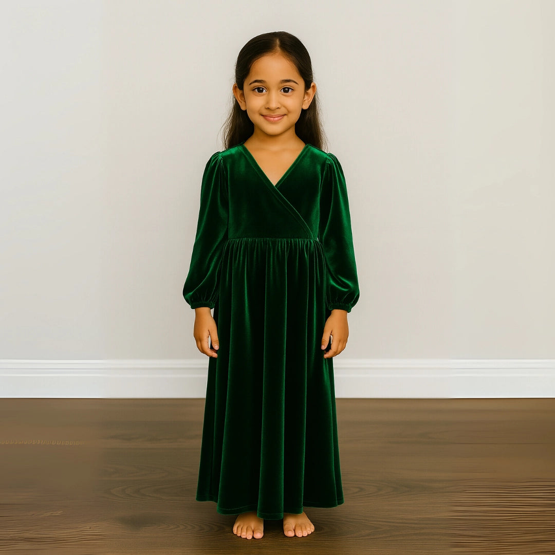 Green Velvet Evening Dress with Long Sleeves For Kid