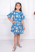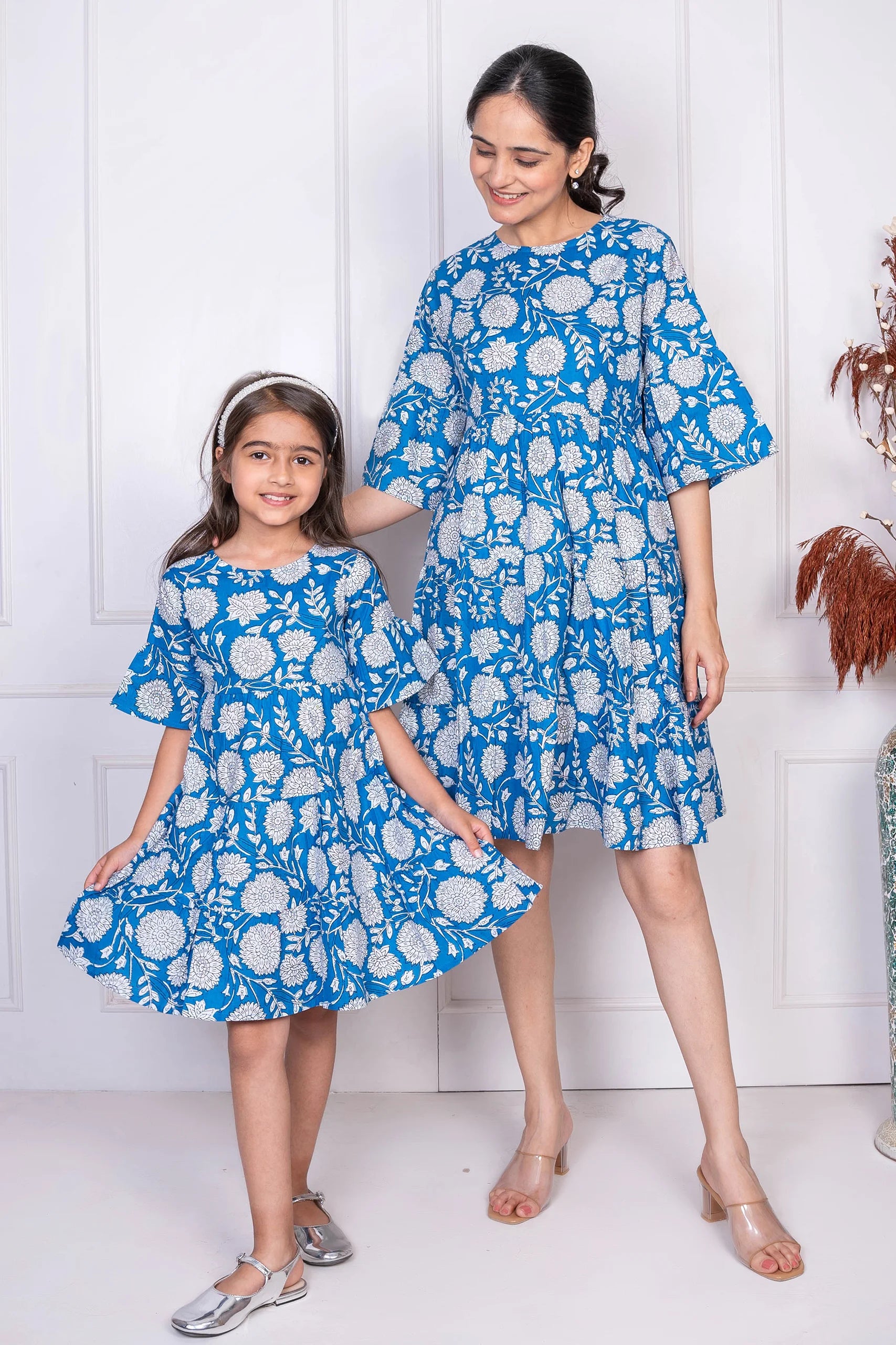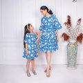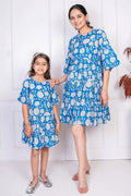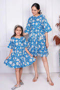 Blue Floral Printed Matching Dresses for Mom and Daughter