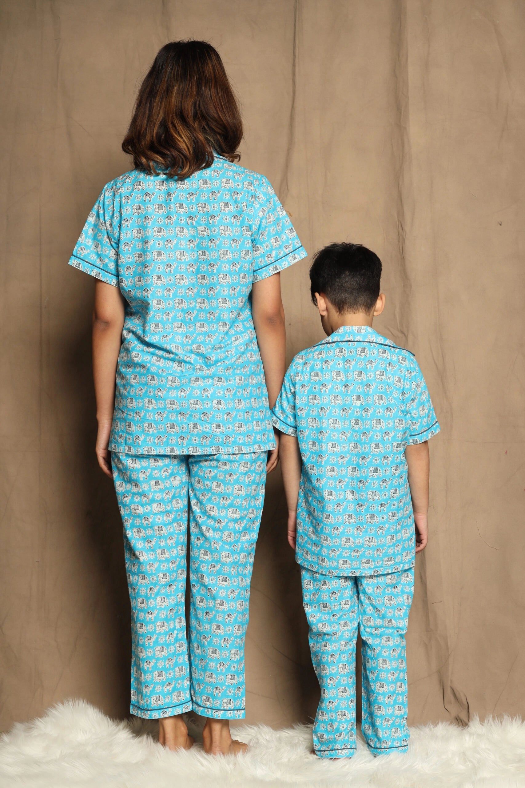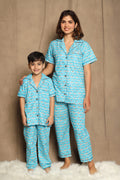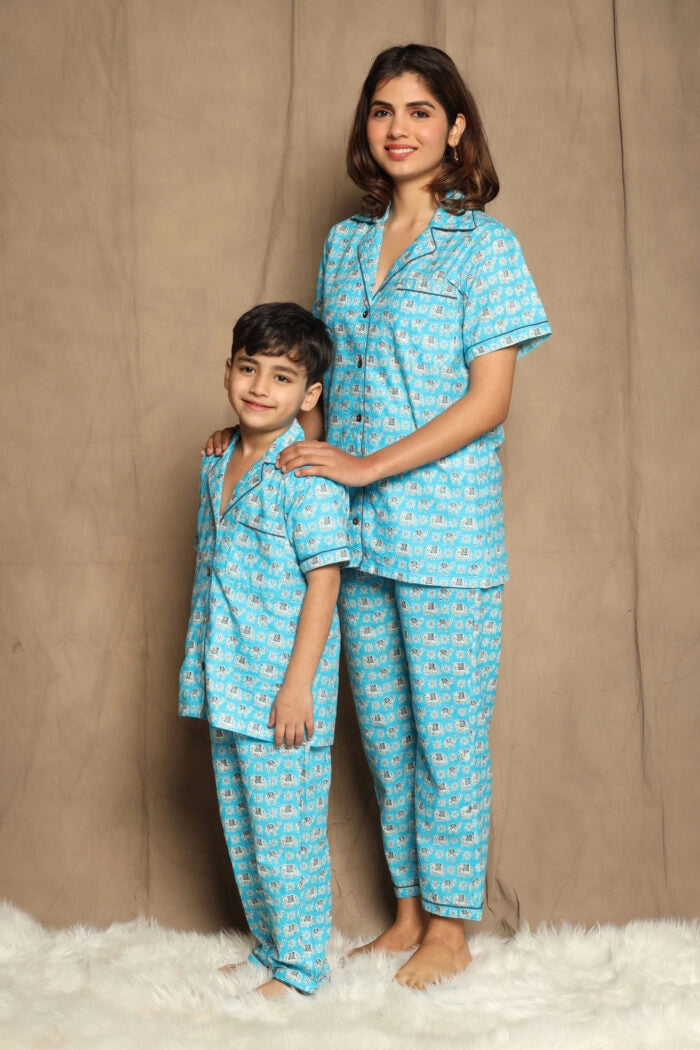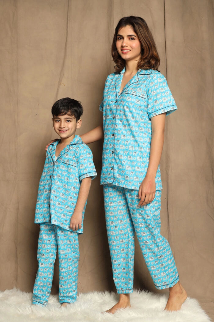 Blue Printed Night Suit matching Set For Mom And Son