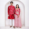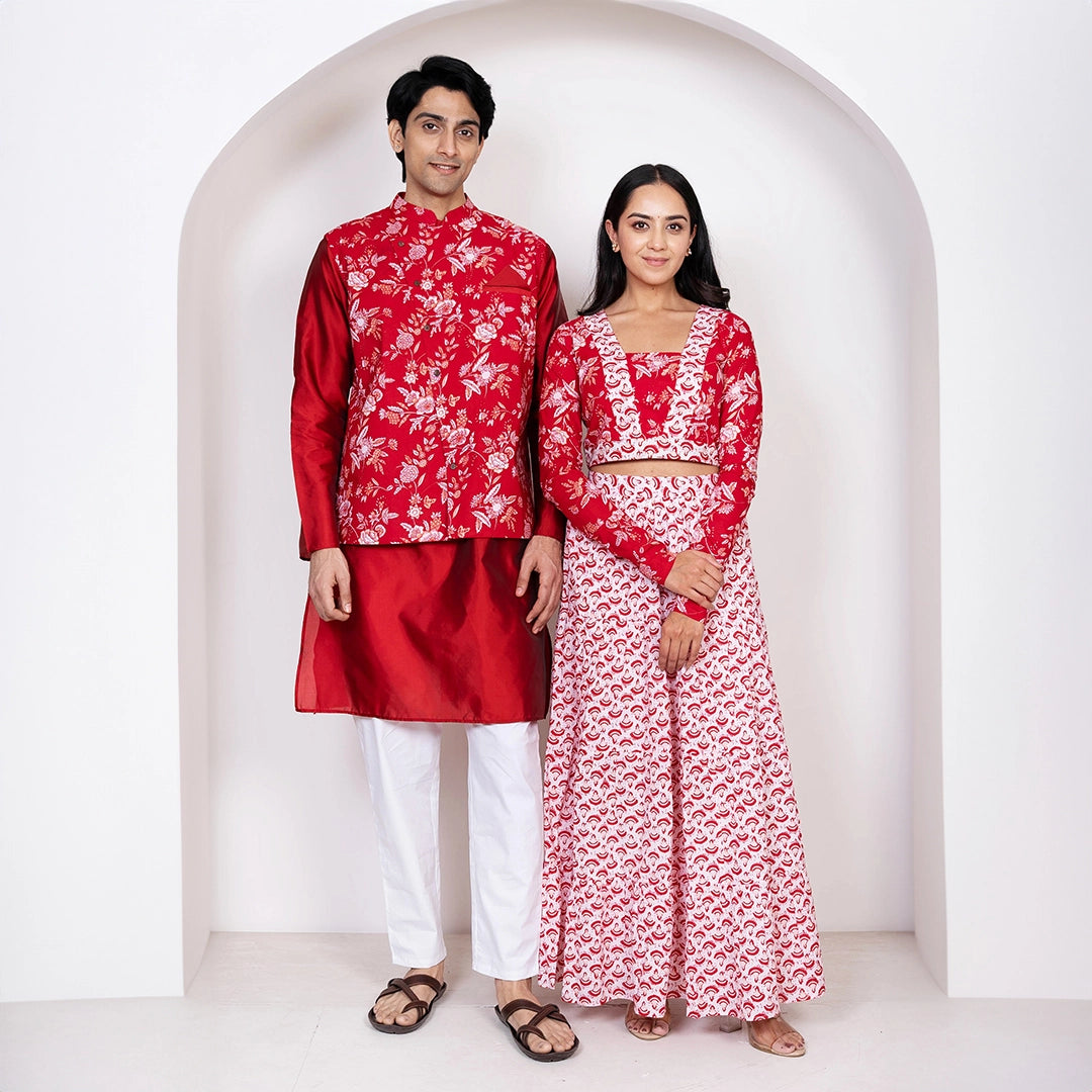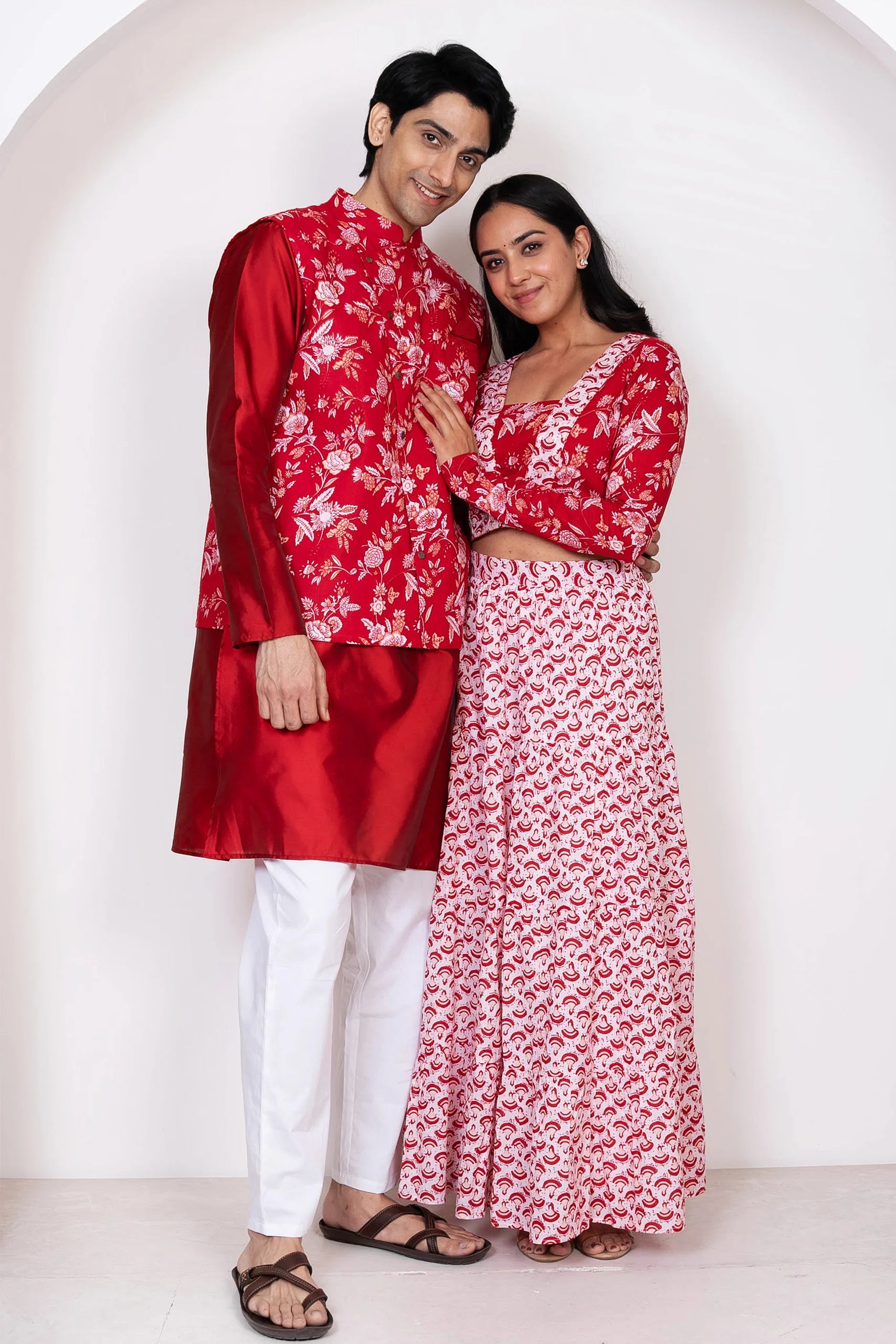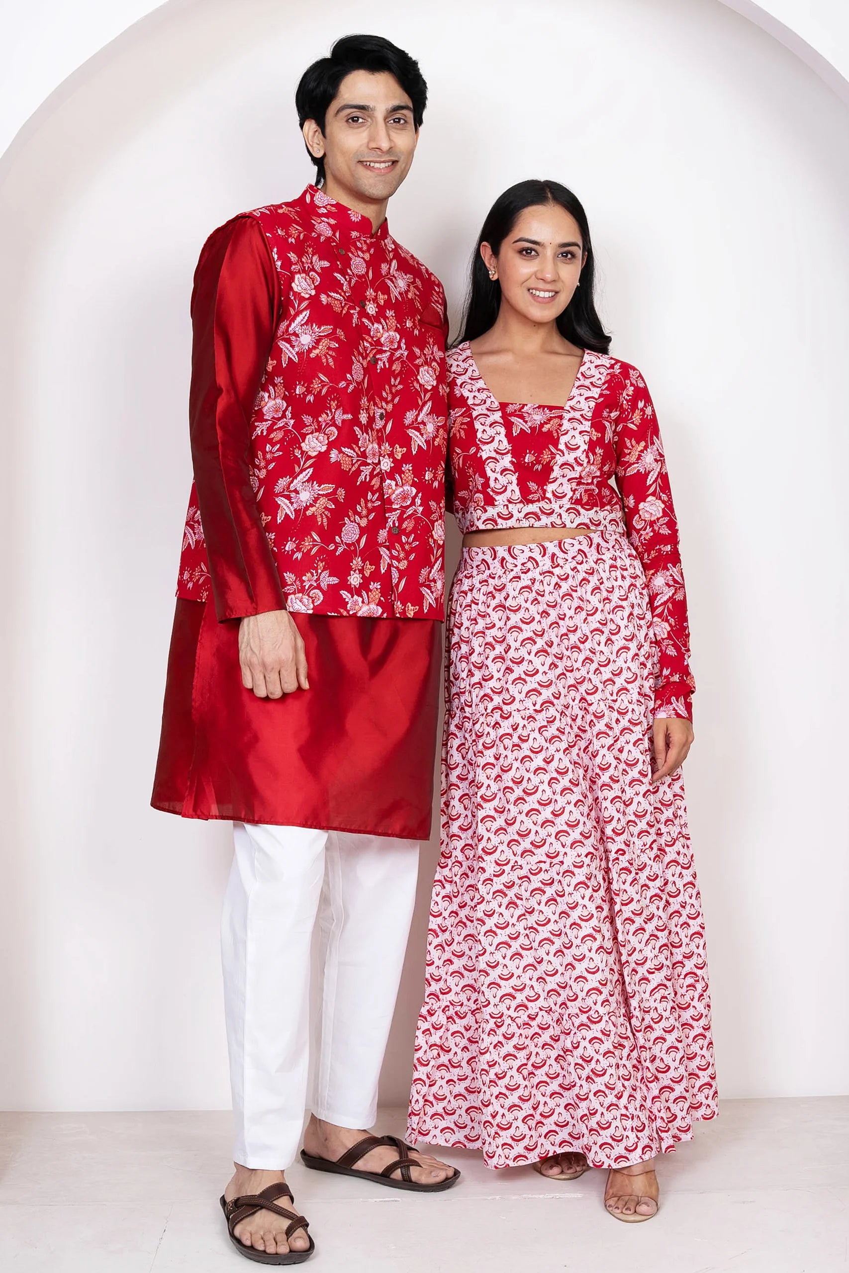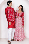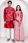 Maroon & White Floral Printed Lehenga Crop Top and Dupatta With Matching Kurta Pyjama Couple Twin Set