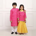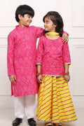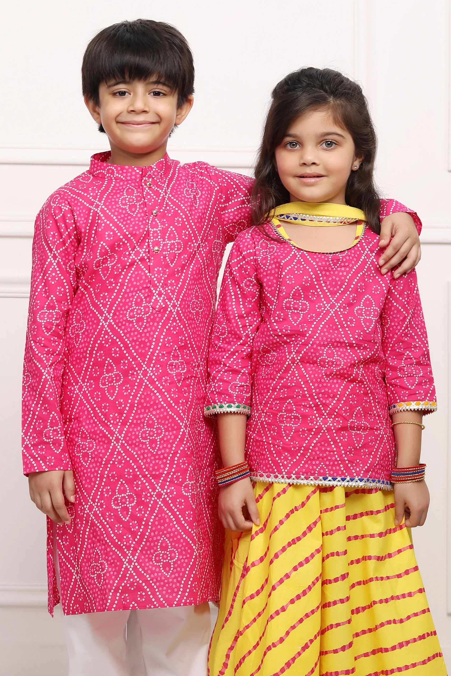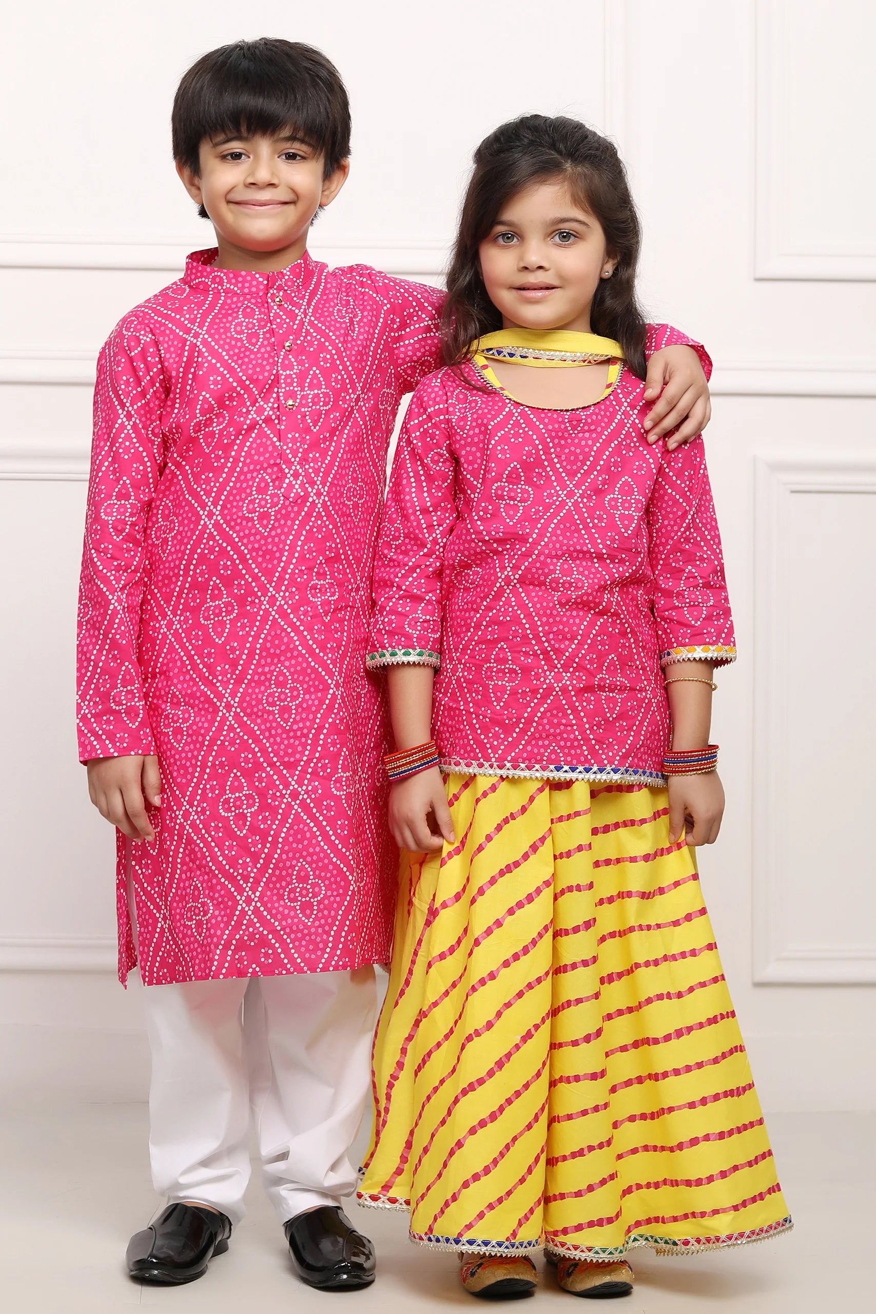 Fuchsia Jaipuri Kurta and Yellow Bandhani Lehenga Set - Brother and Sister Twin Outfits