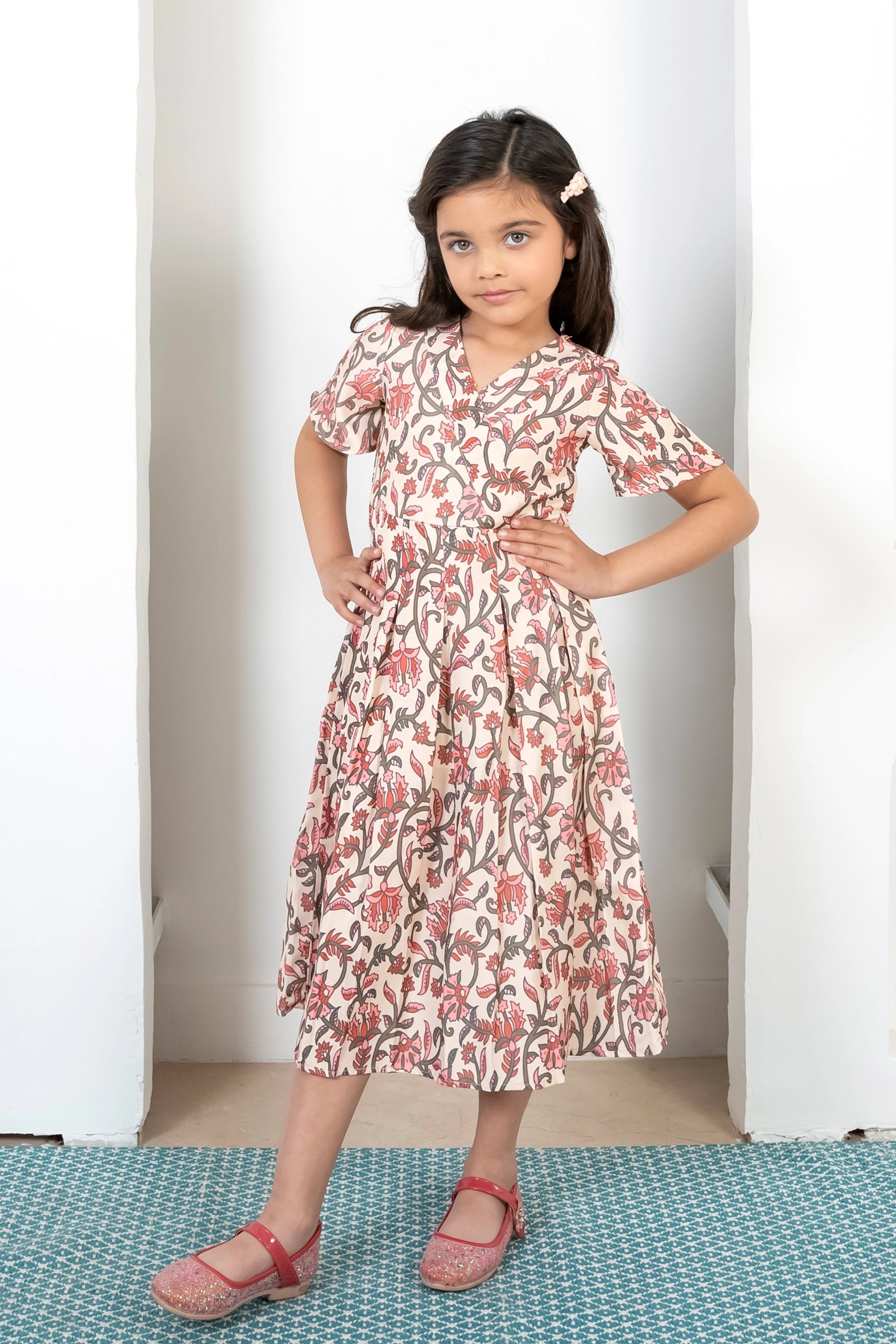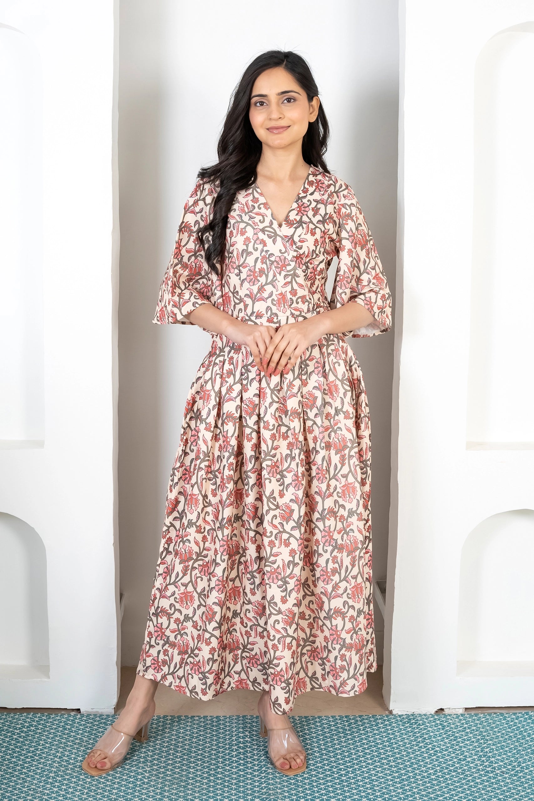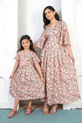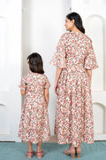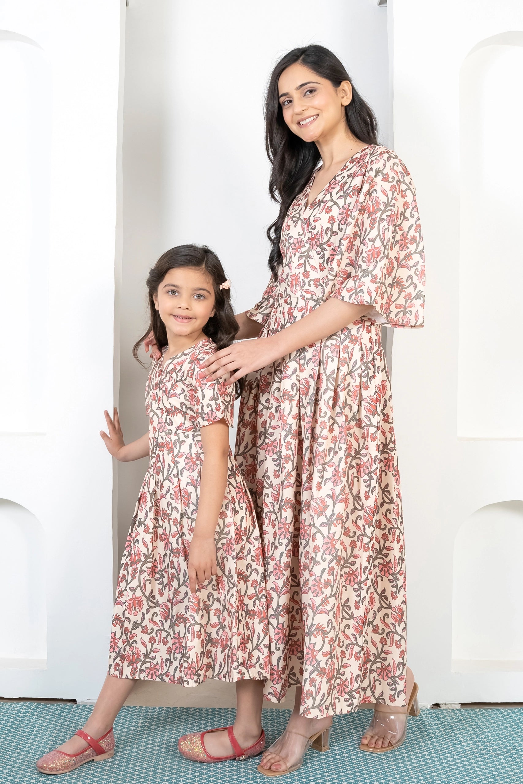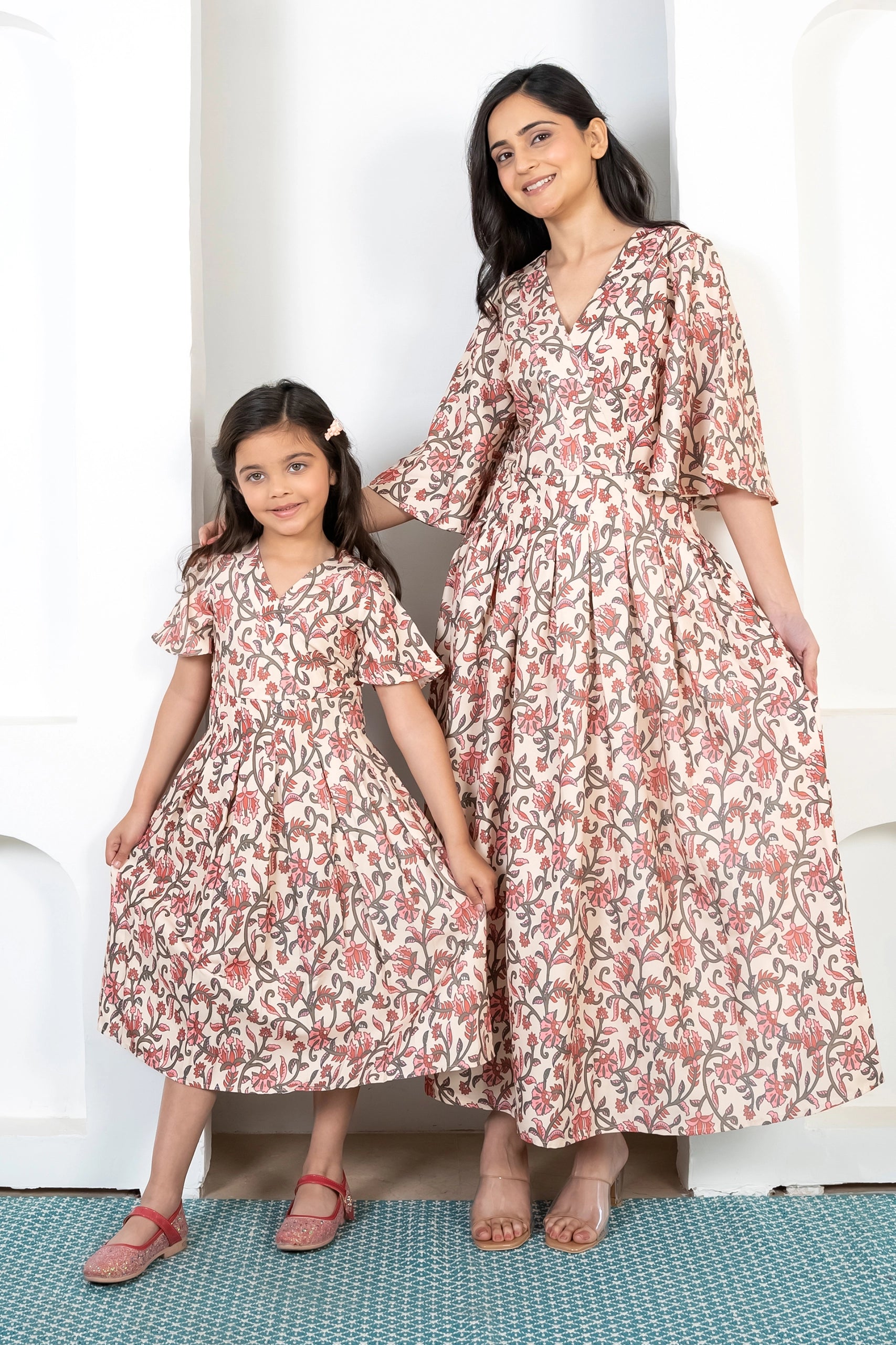 Matching Summer Wear Outfits: Comfy Cream and Red Floral Printed Maxi Dresses for Mom and Daughter