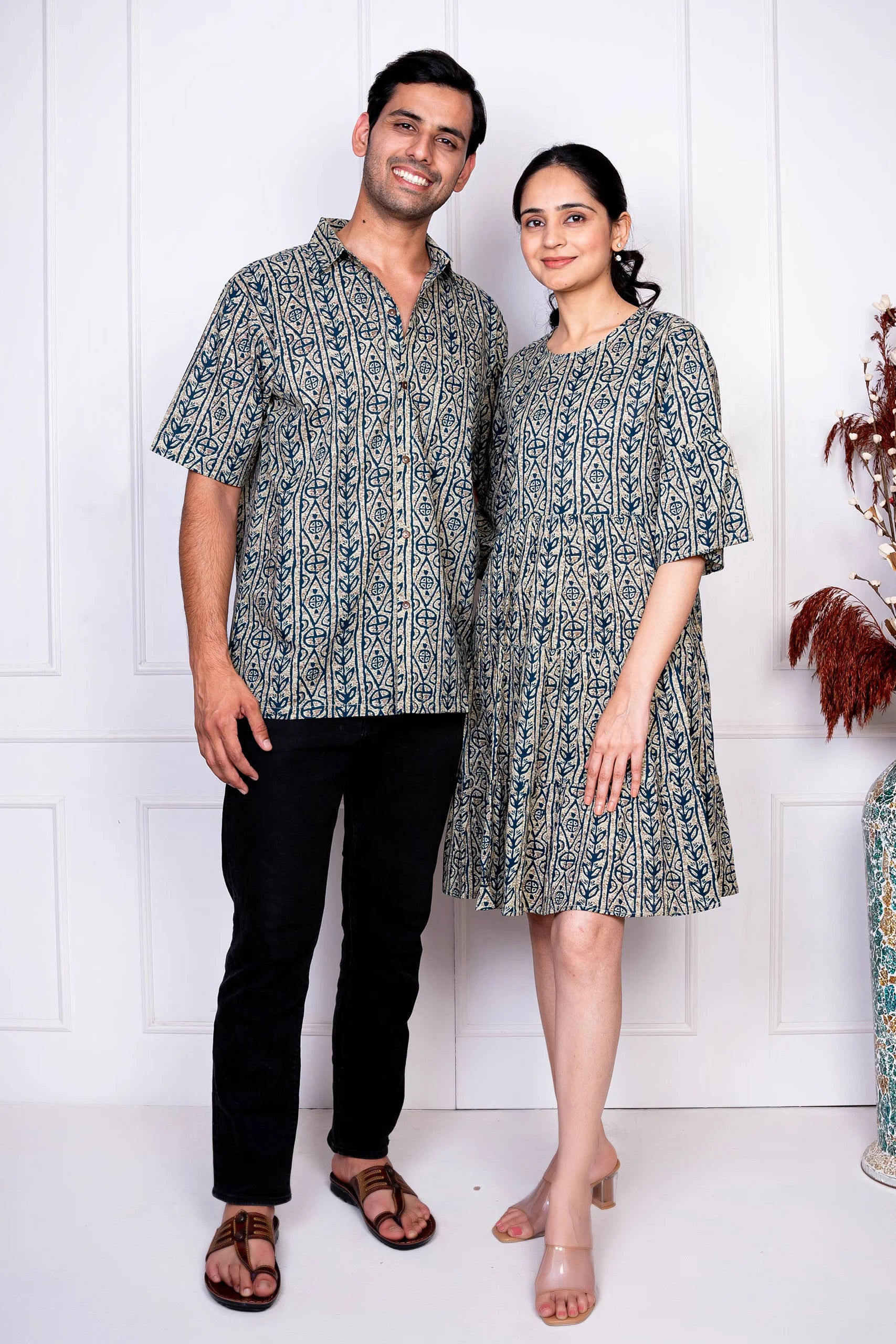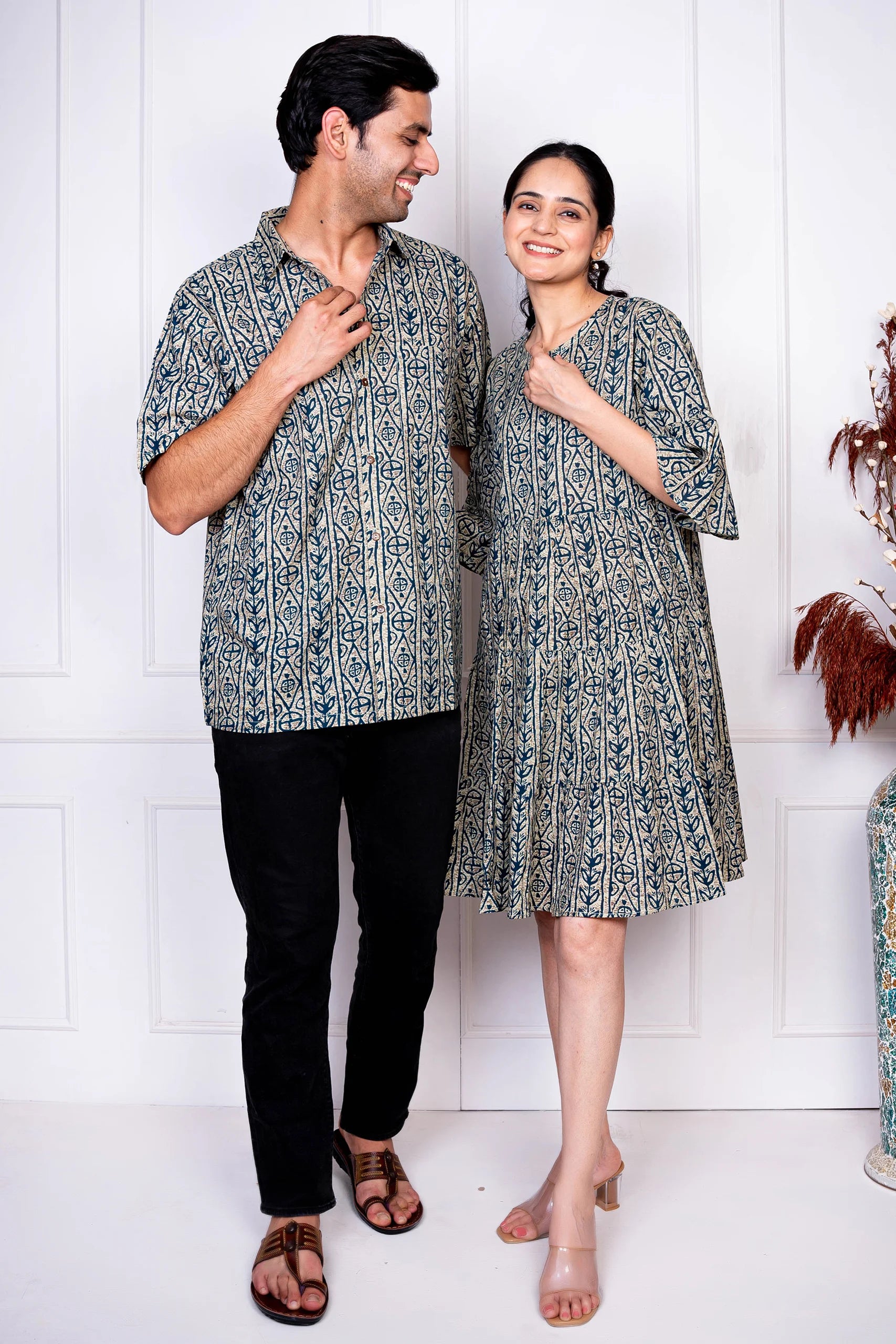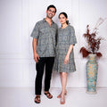 Grey And Blue Printed Dress With Matching Shirt Couple Twin Set
