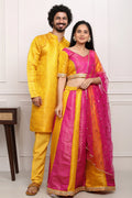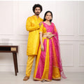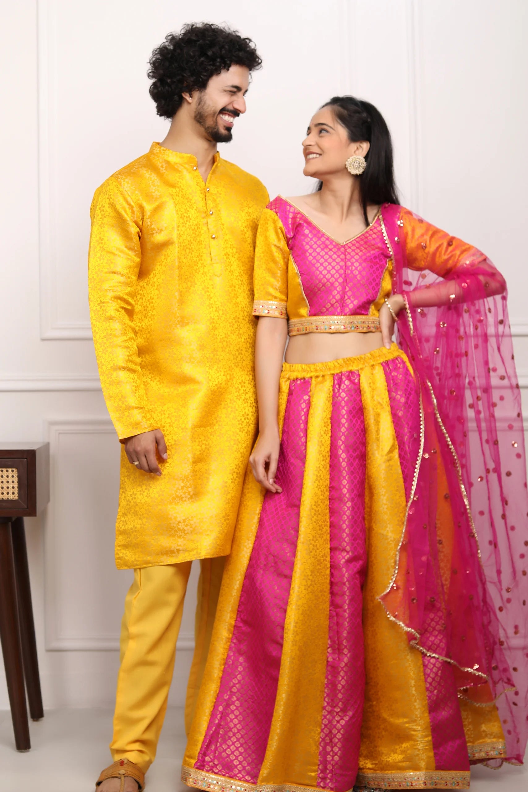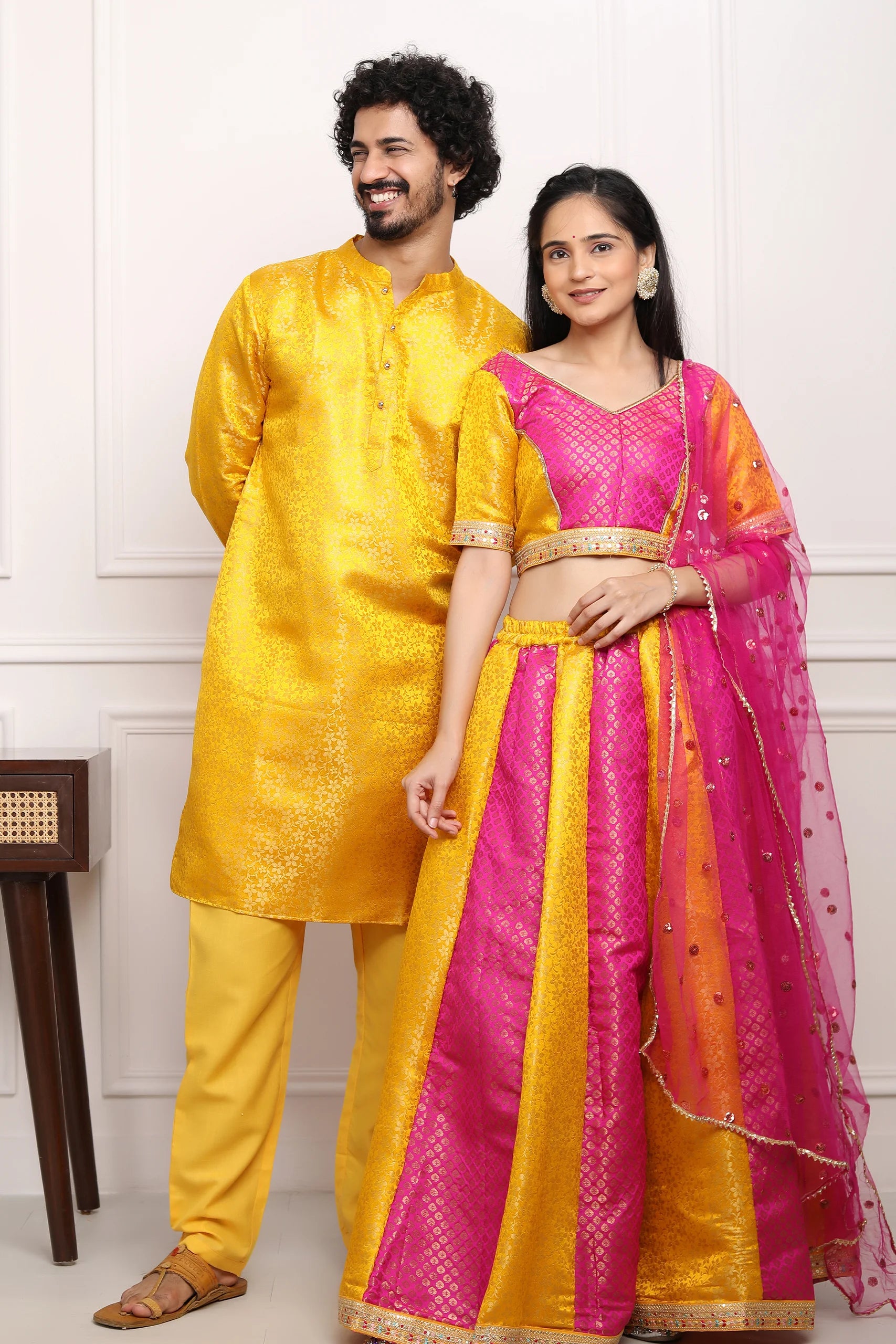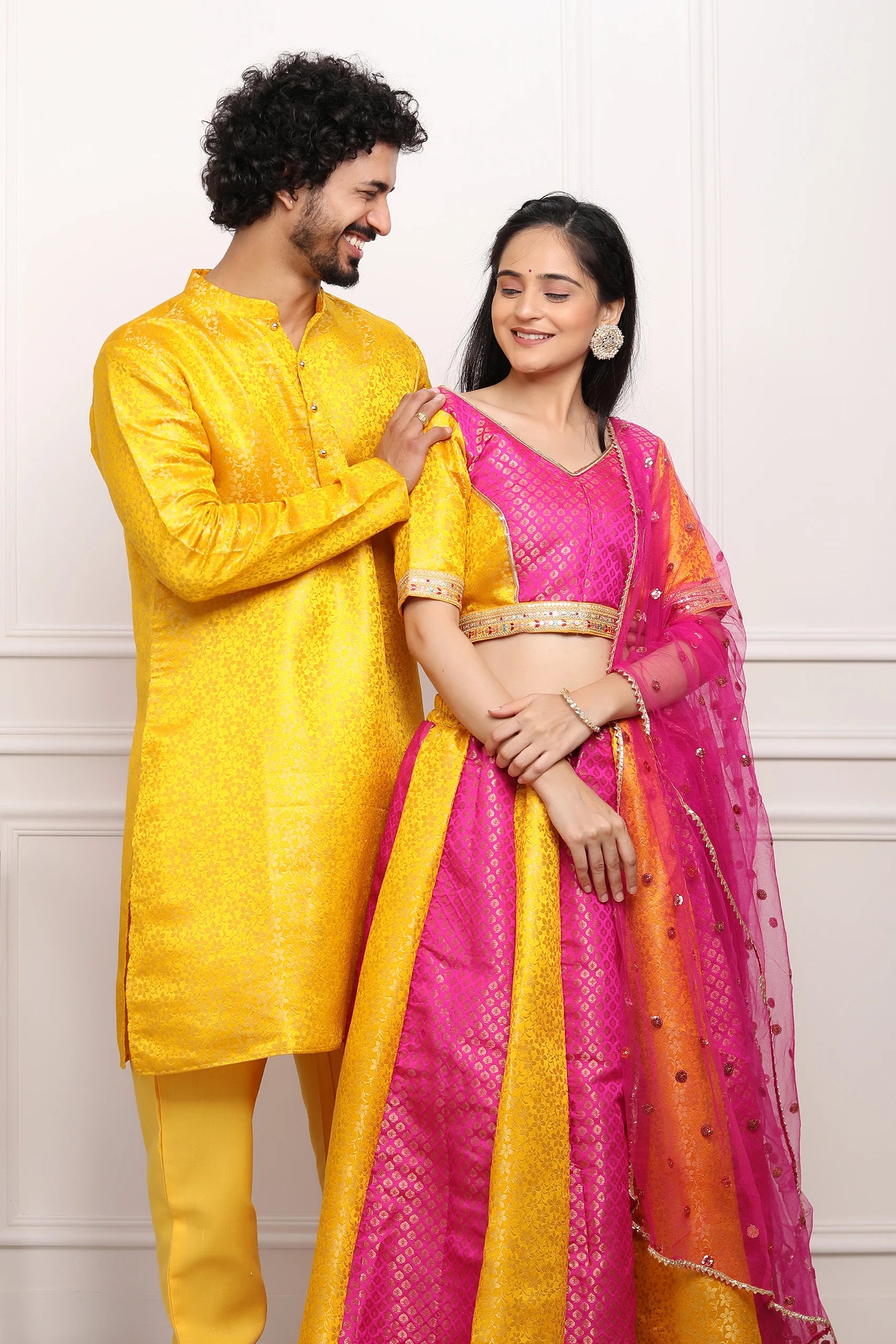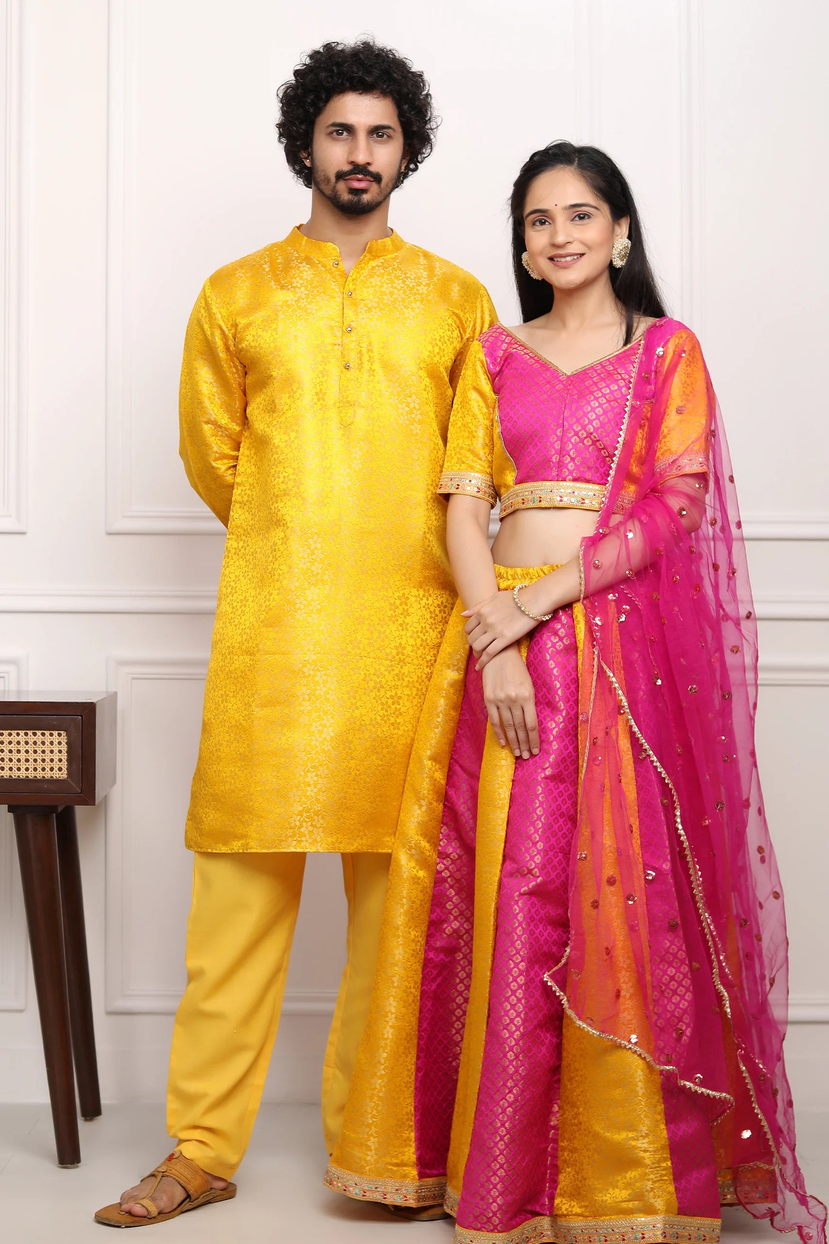 Fuchsia and Amber Brocade Lehenga Choli with Matching Kurta Pyjama Couple Set