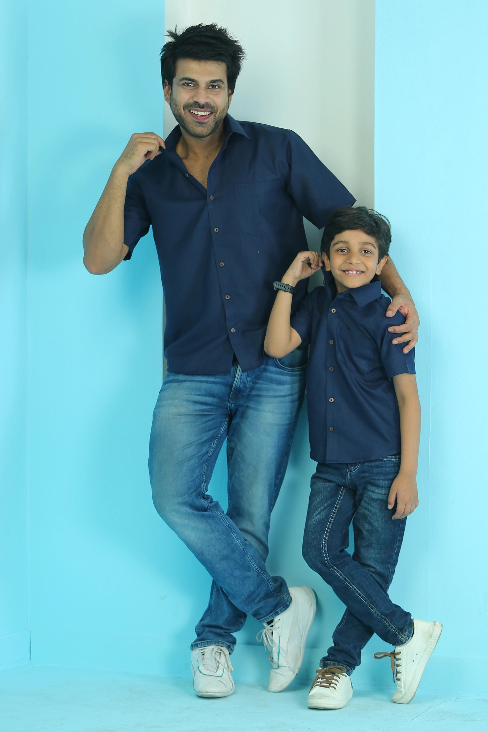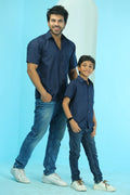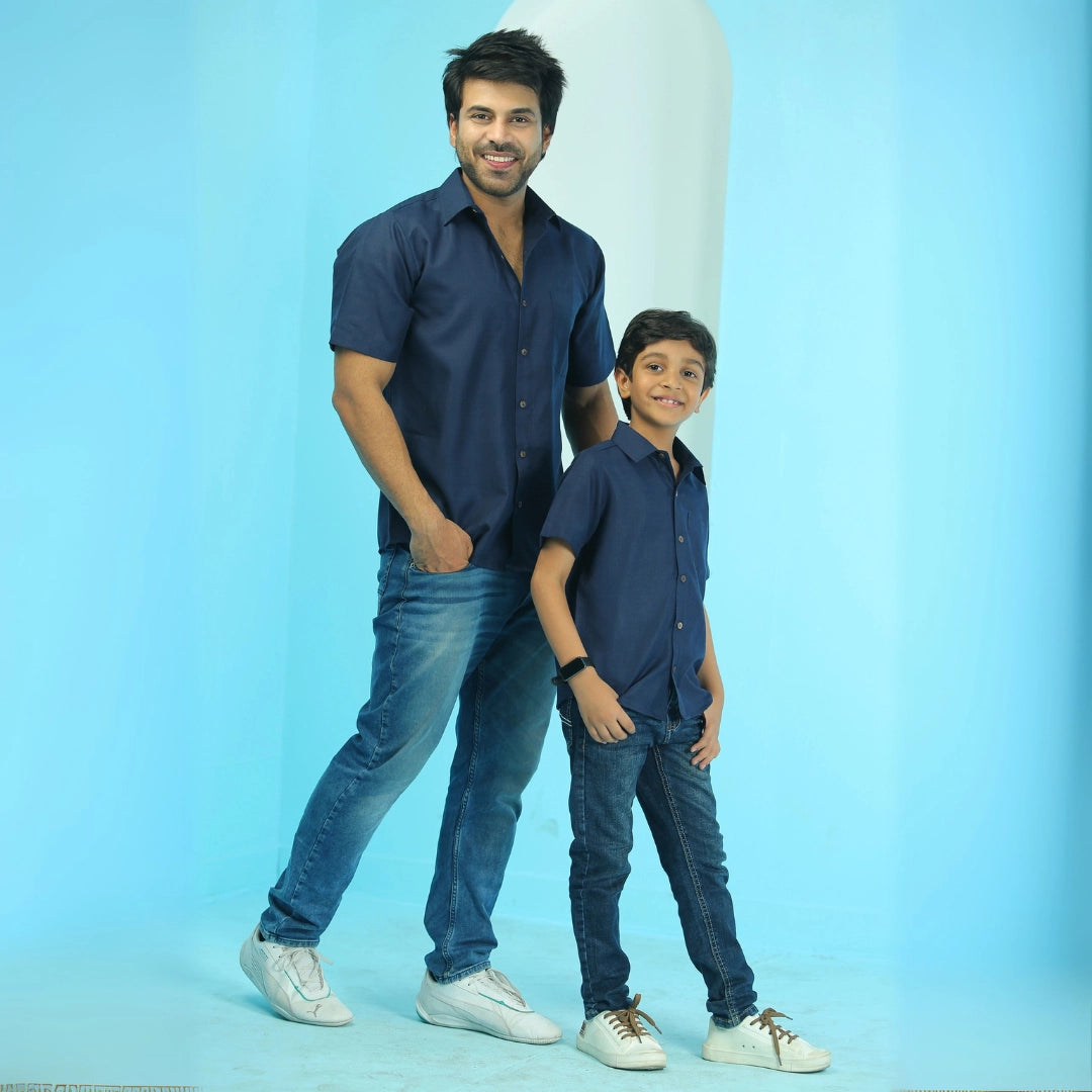 Elegant Plain Navy Blue Matching Shirts for Father and Son