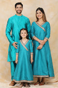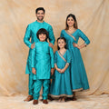 Exquisite Peacock Blue Ethnic Silk Gown with Matching Kurta Pyjama Family Matching Set