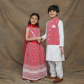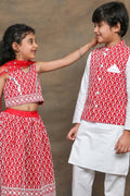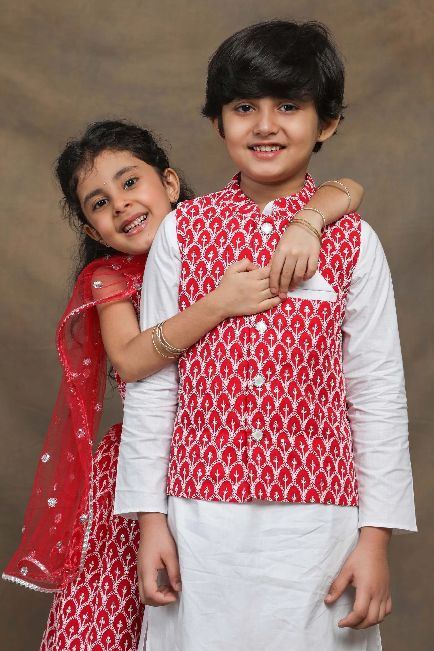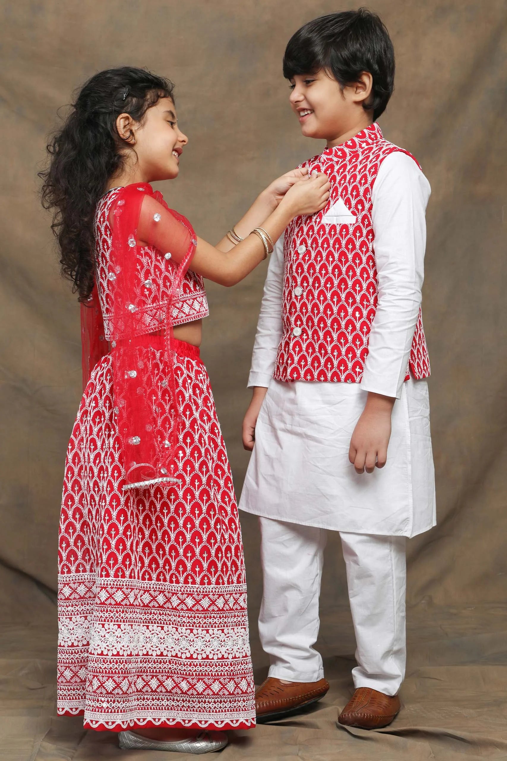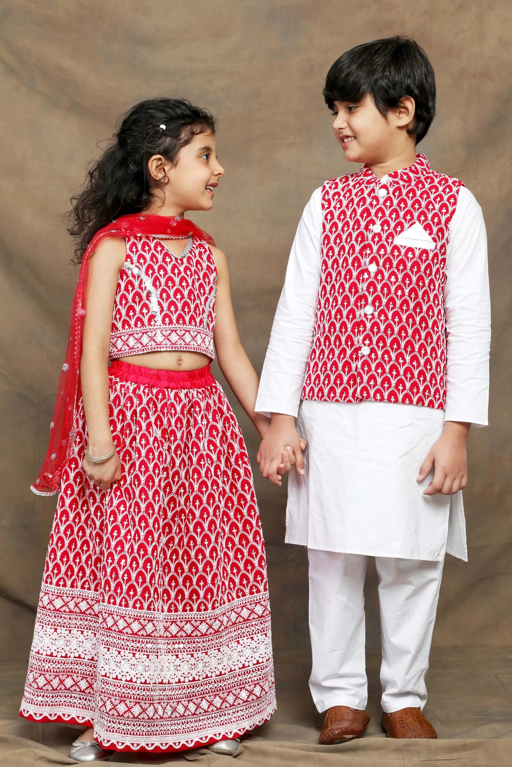Ethnic Embroidered Twin Set for Brothers and Sisters in Fuchsia and White