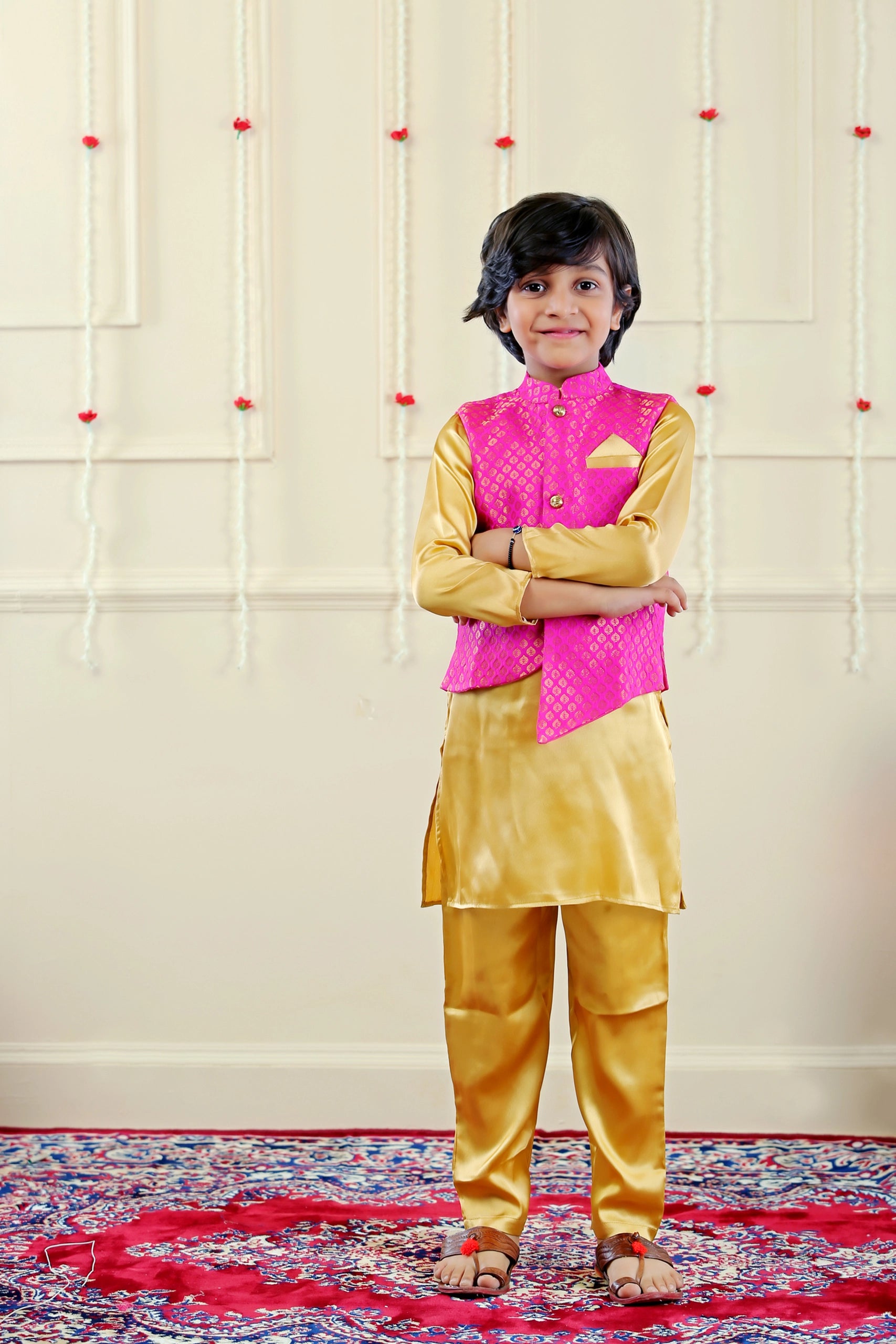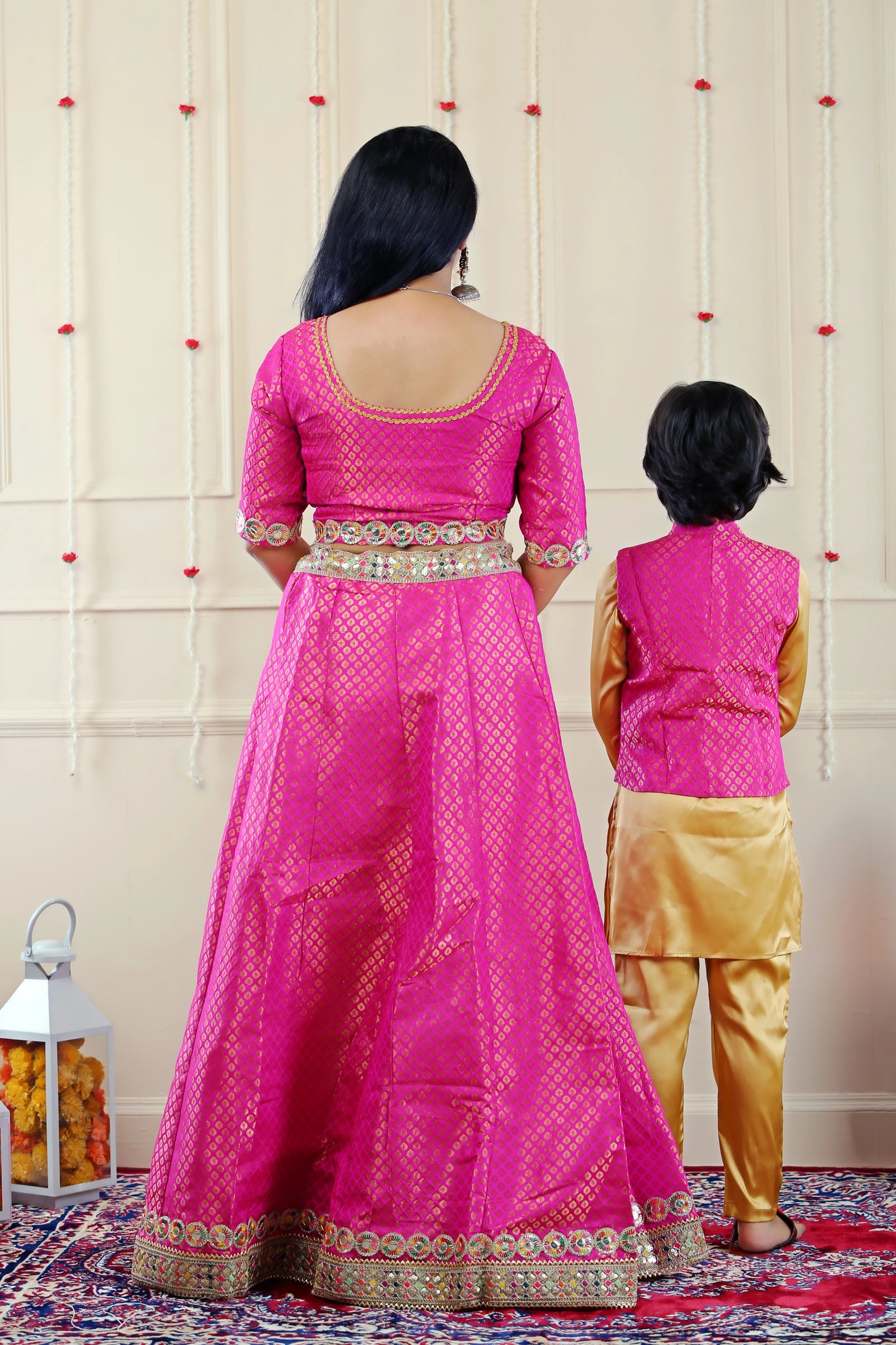Fuschia Pink Lehenga Choli with Golden Kurta Pyjama and MAtching Pink Jacket ( Mom and Son Twin Set )