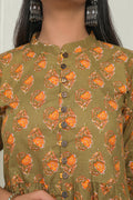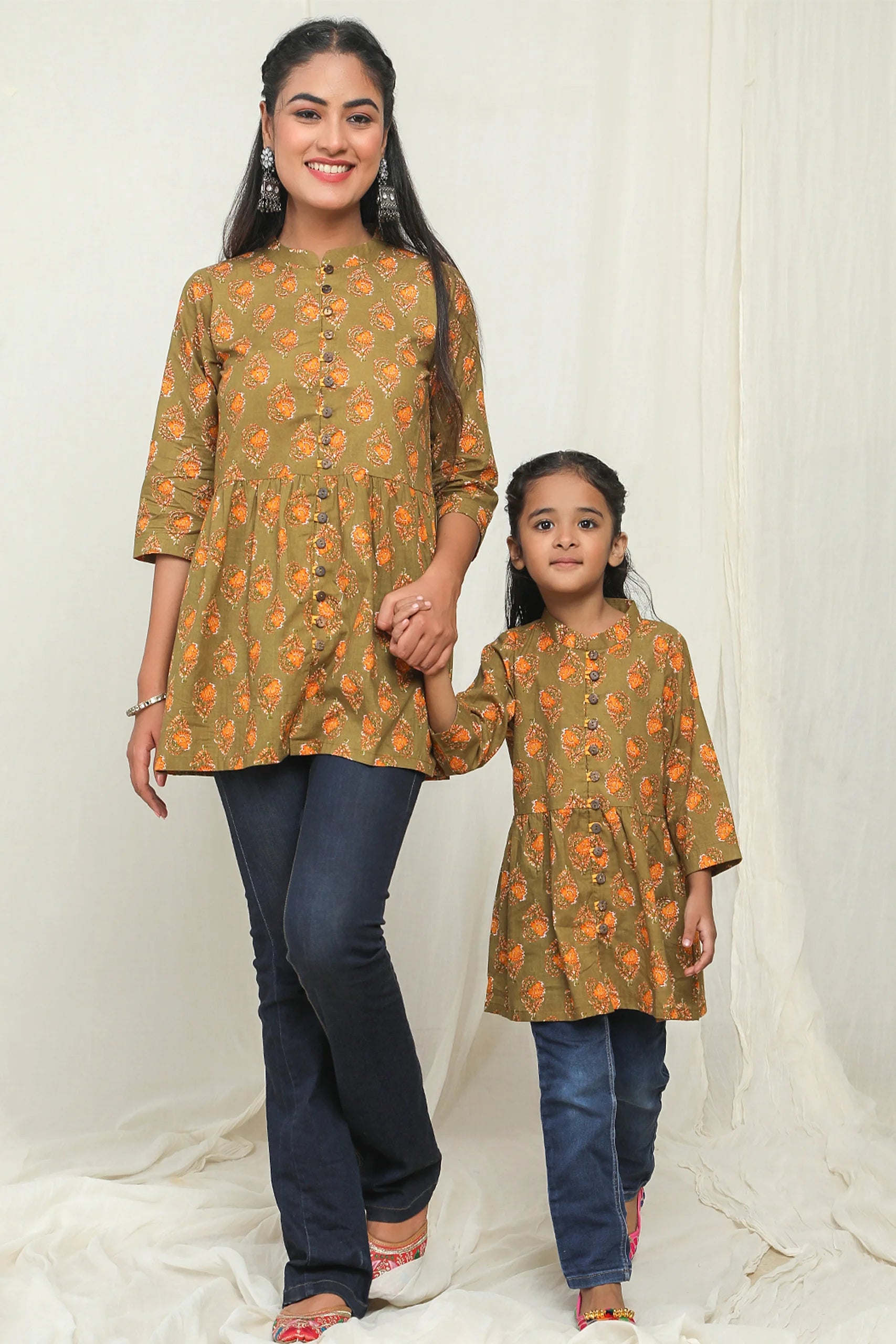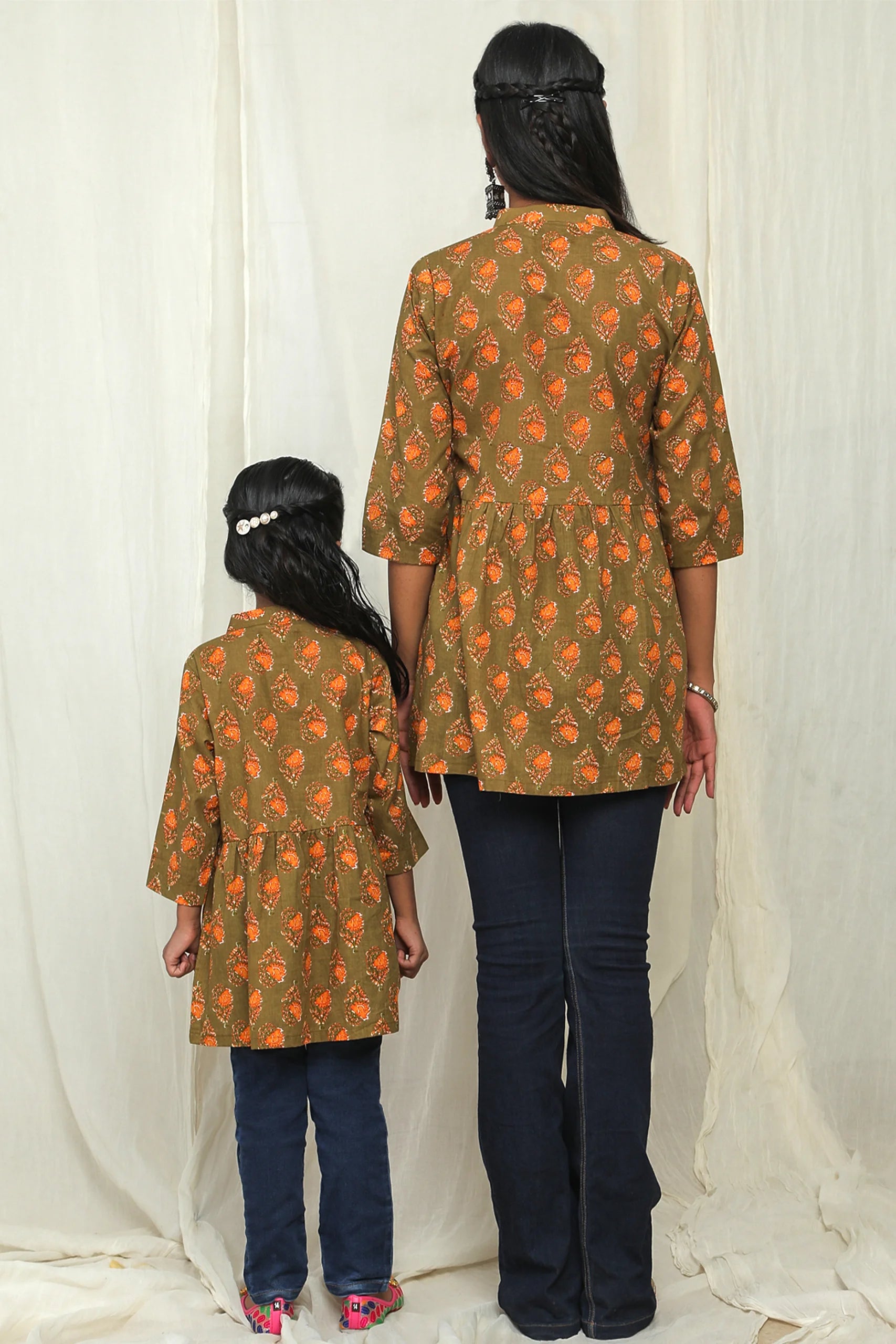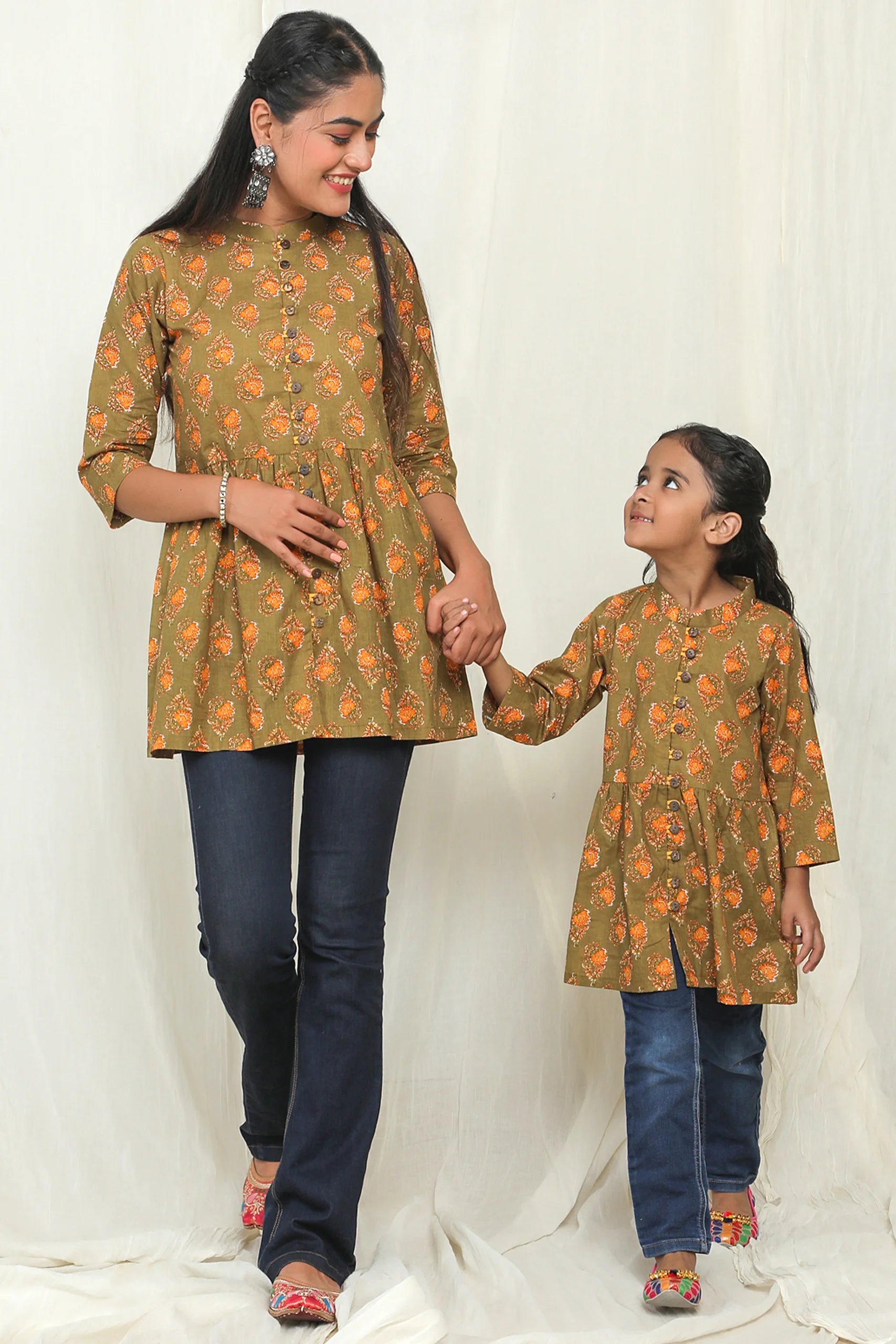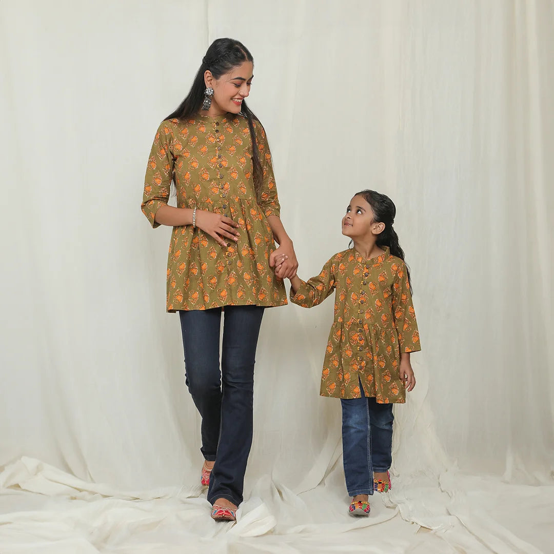 Matching Green and Yellow Printed Tops for Mother and Daughter