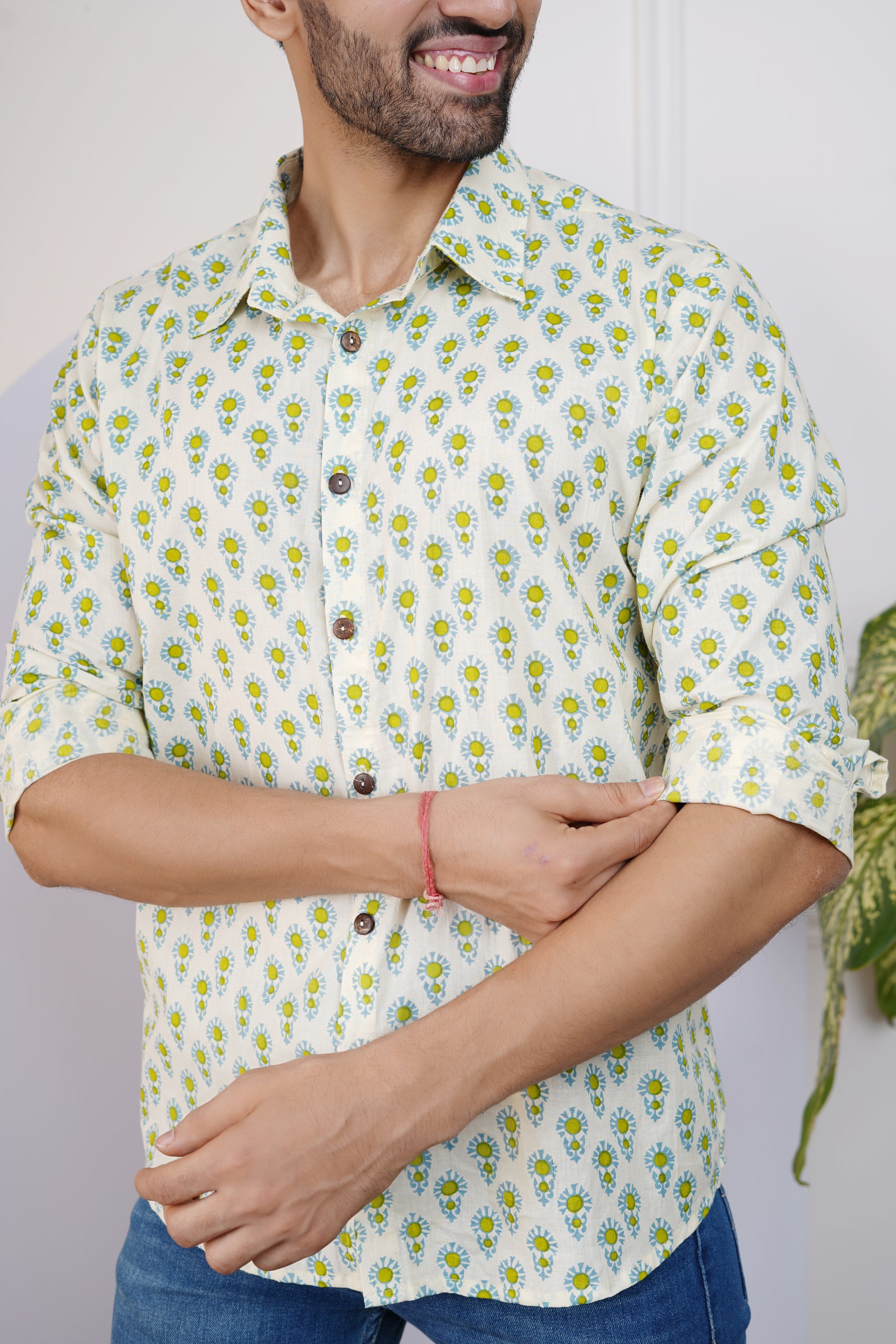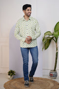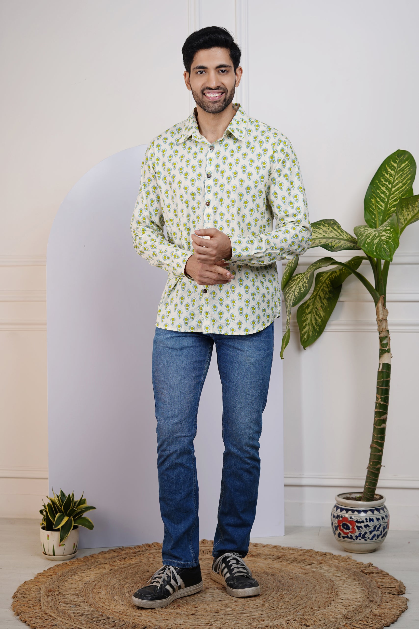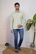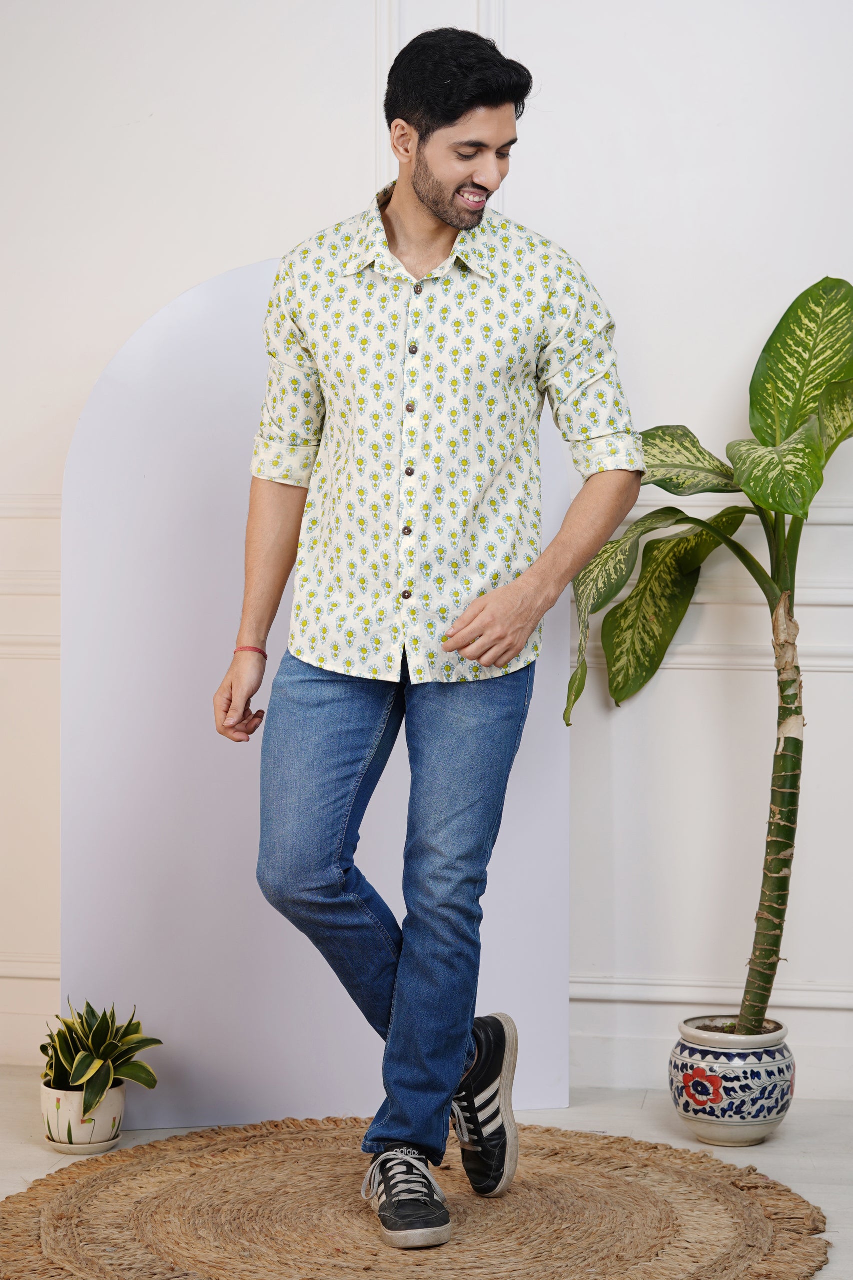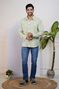 Upgrade your wardrobe with our Green Printed Shirt for Men. Made with 100% cotton, this shirt offers a lightweight and breathable feel, perfect for all-day comfort. Featuring a full sleeve design and classic collared neck, it's ideal for both casual and formal occasions. The subtle leaf print in green adds a touch of style to this versatile piece.