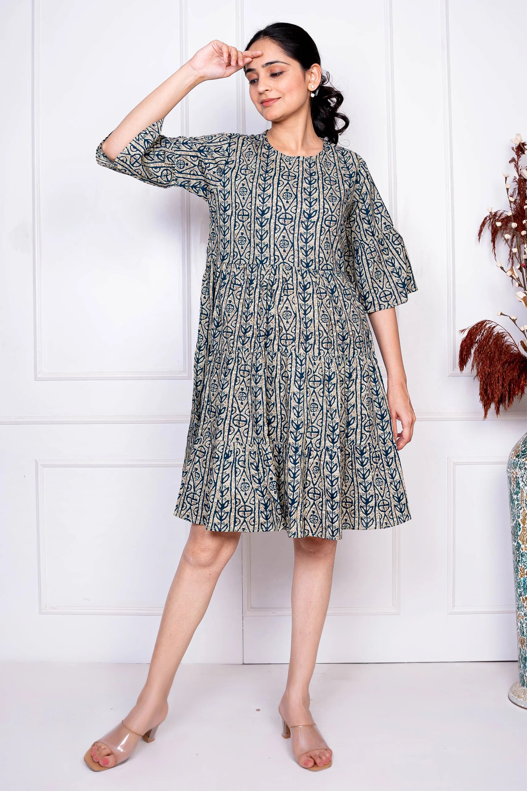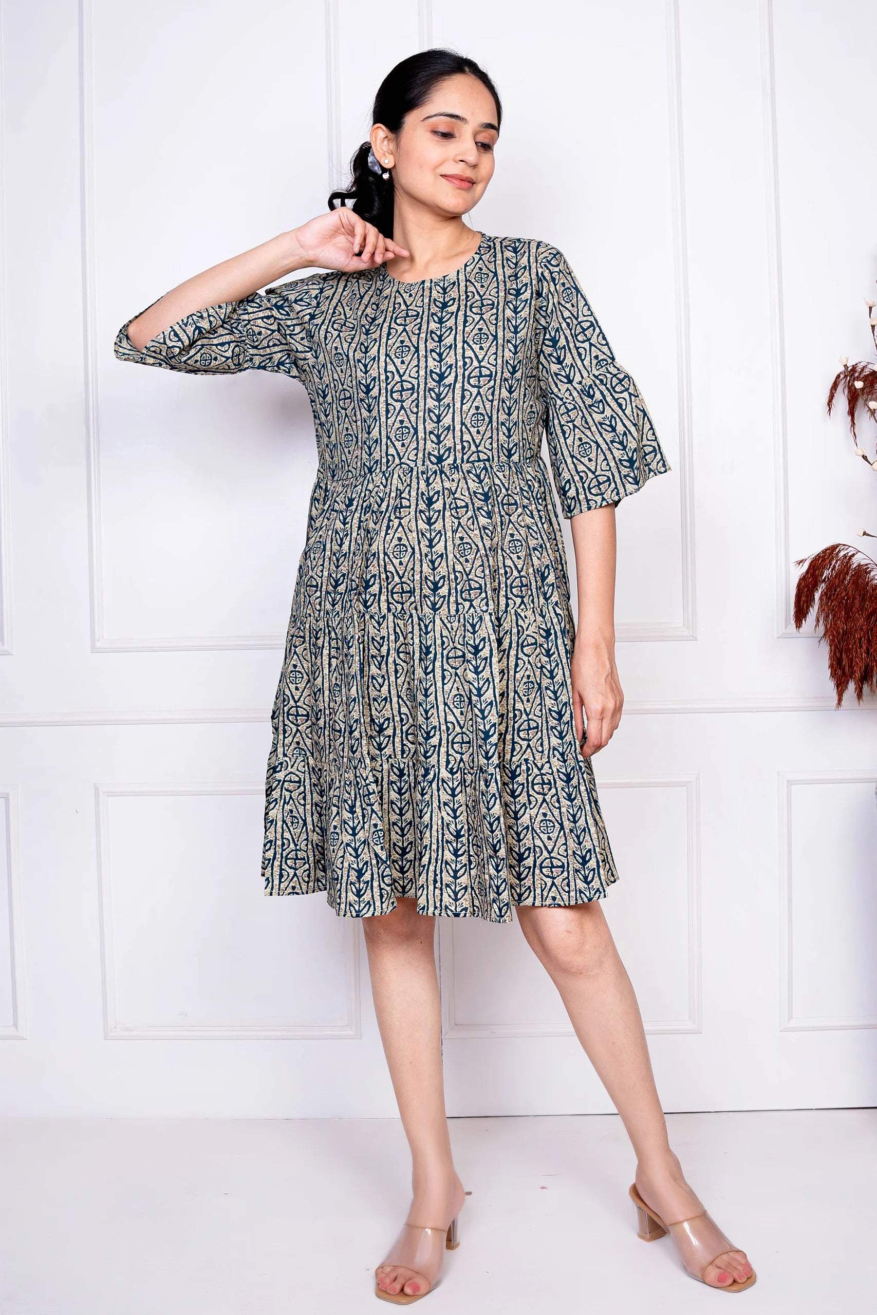 Grey & Blue Printed Cotton Dress for Women