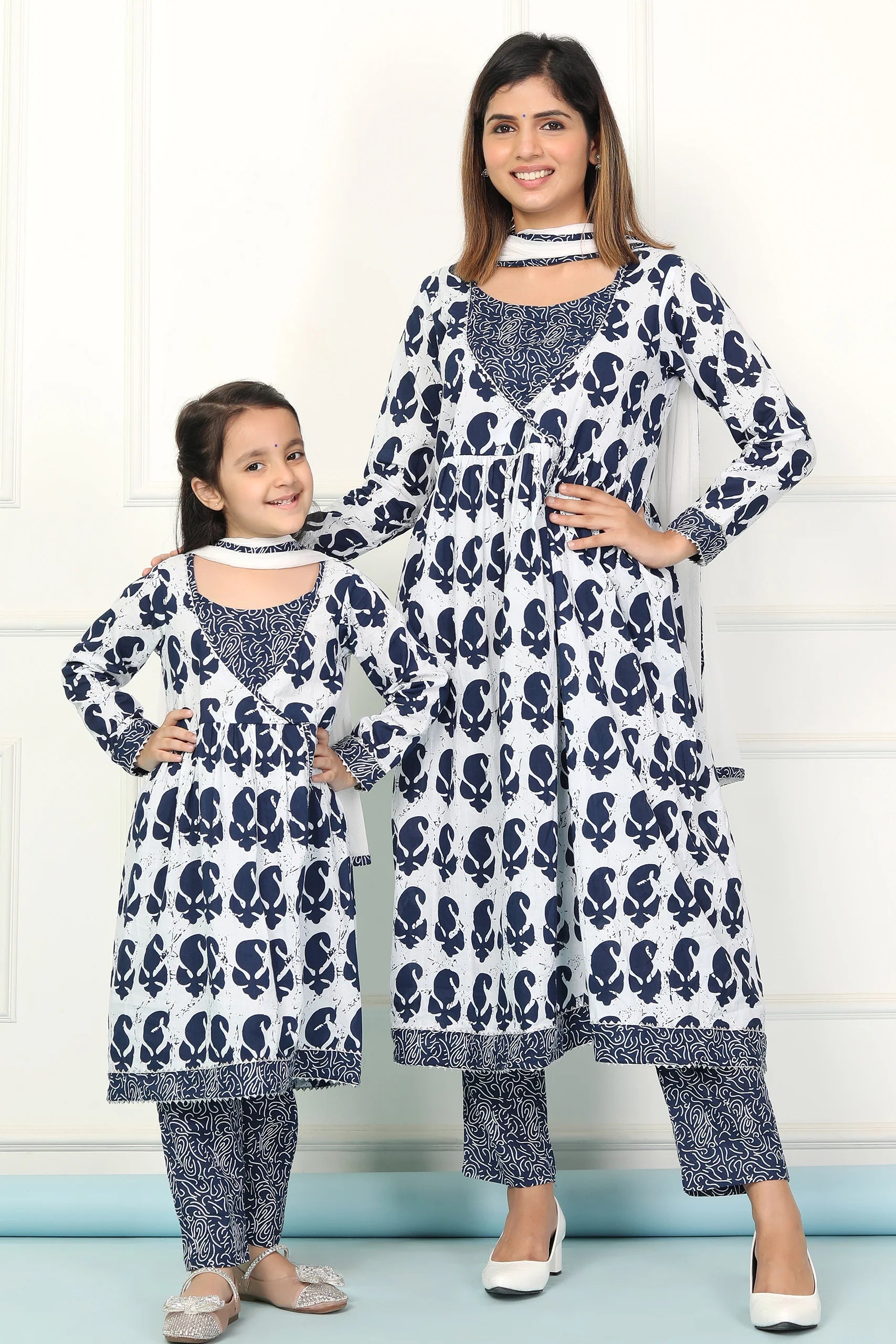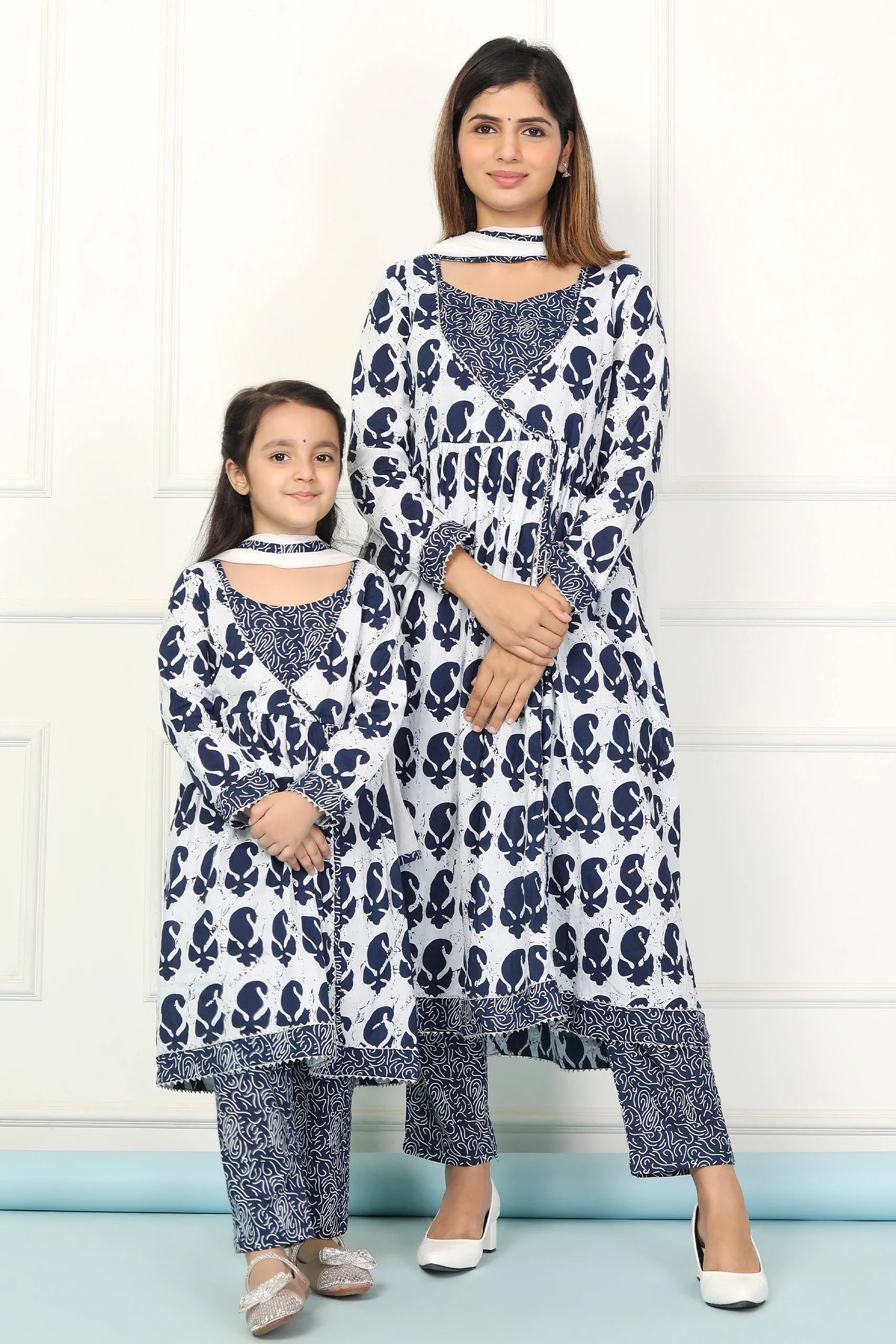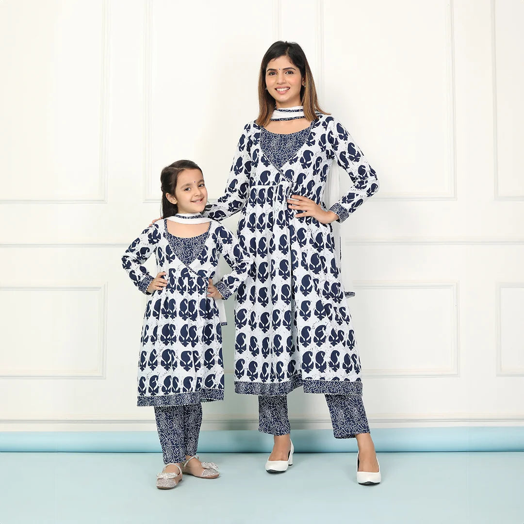 Navy and White Indigo Printed Matching Set for Mother and Daughter