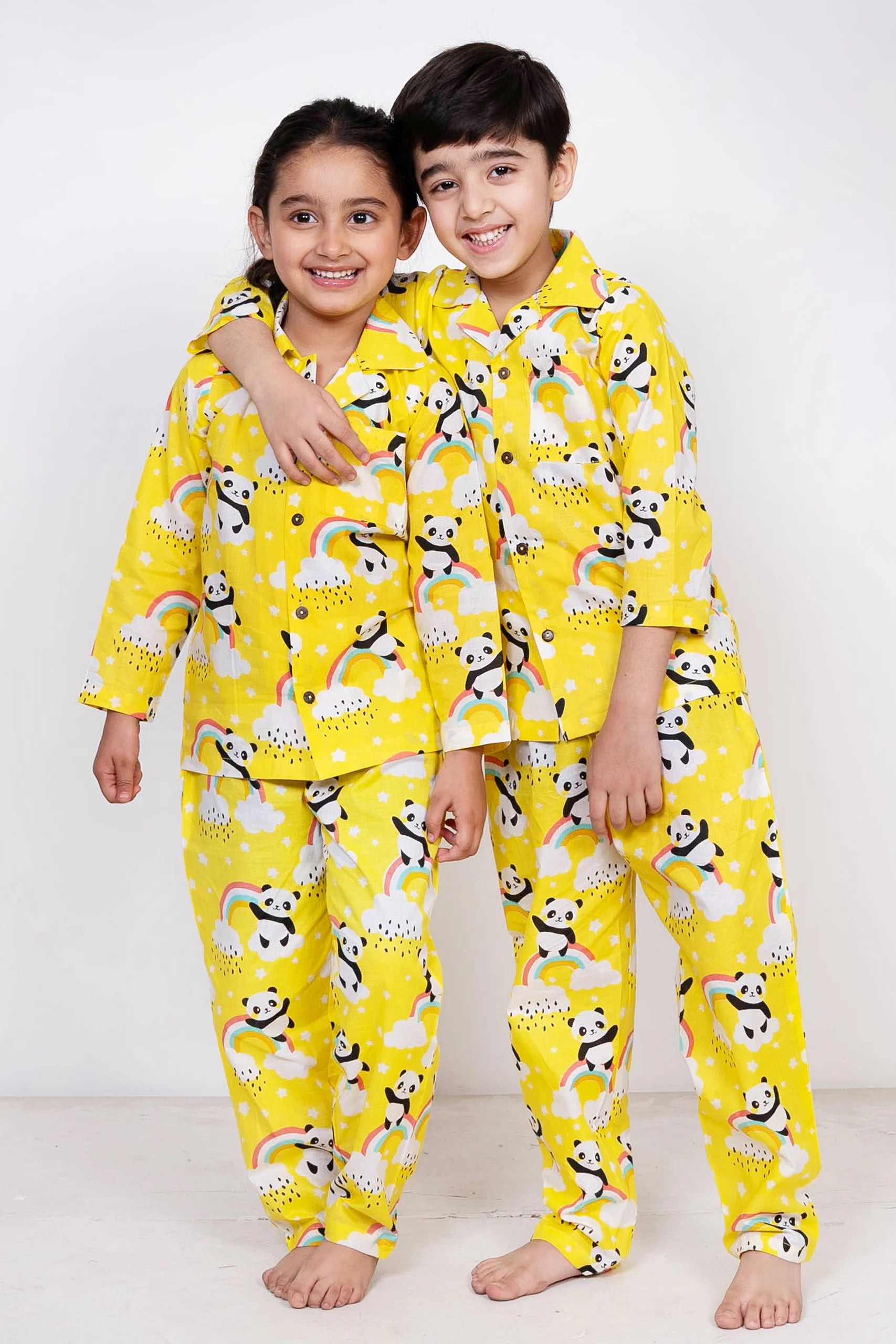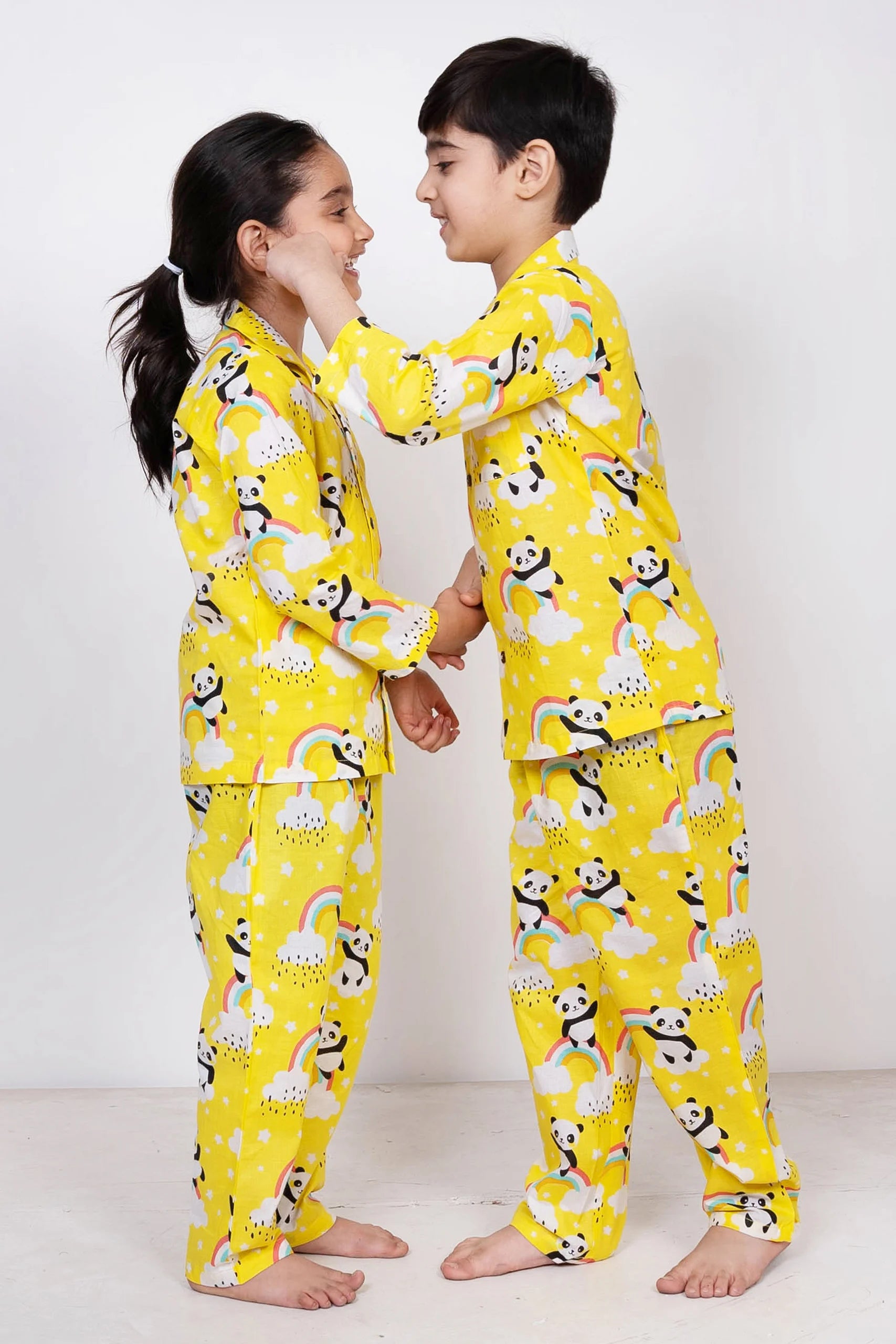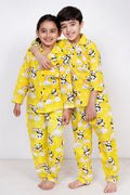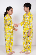 Lemony Yellow and White Floral Printed Night Suit Set For Brother and Sister