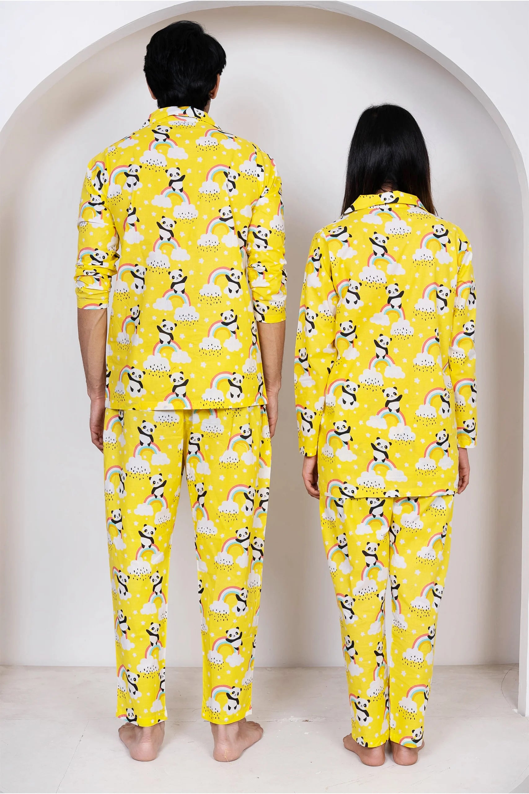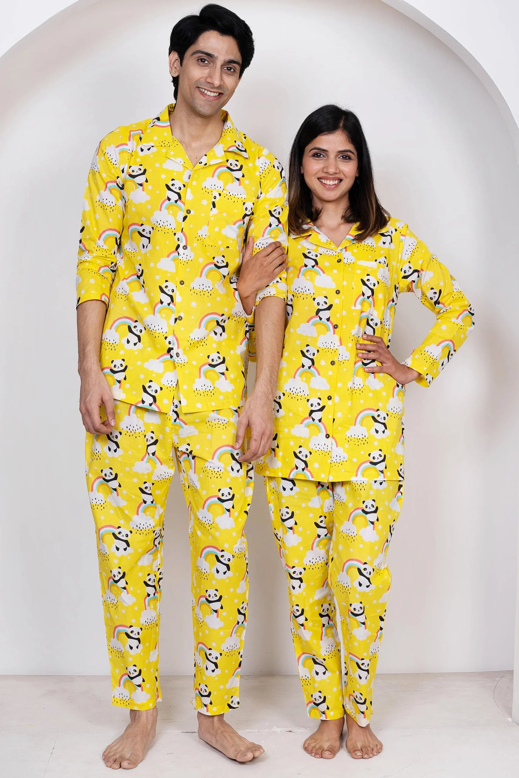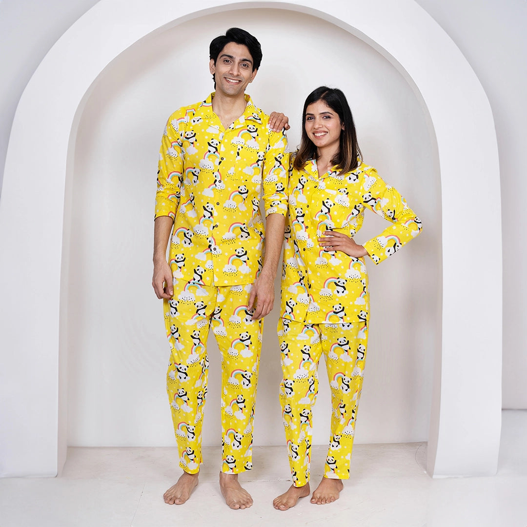 Lemony Yellow and White Floral Printed Night Suit Set For Couple