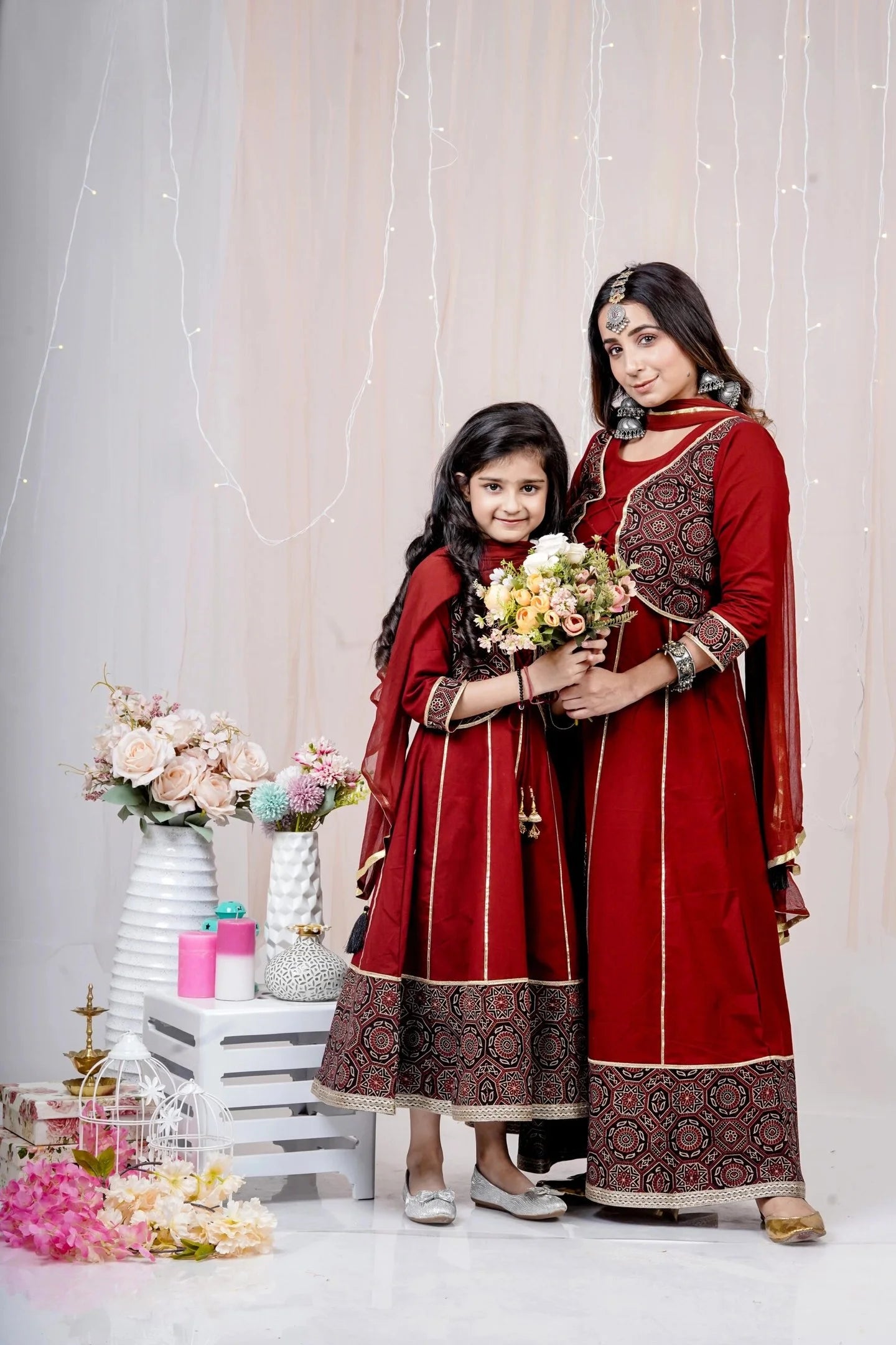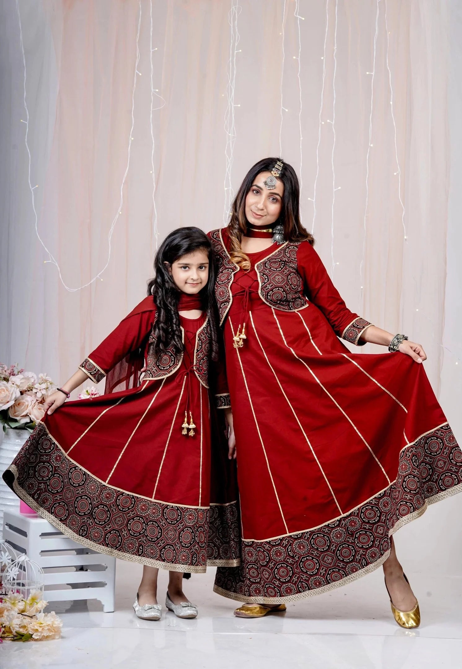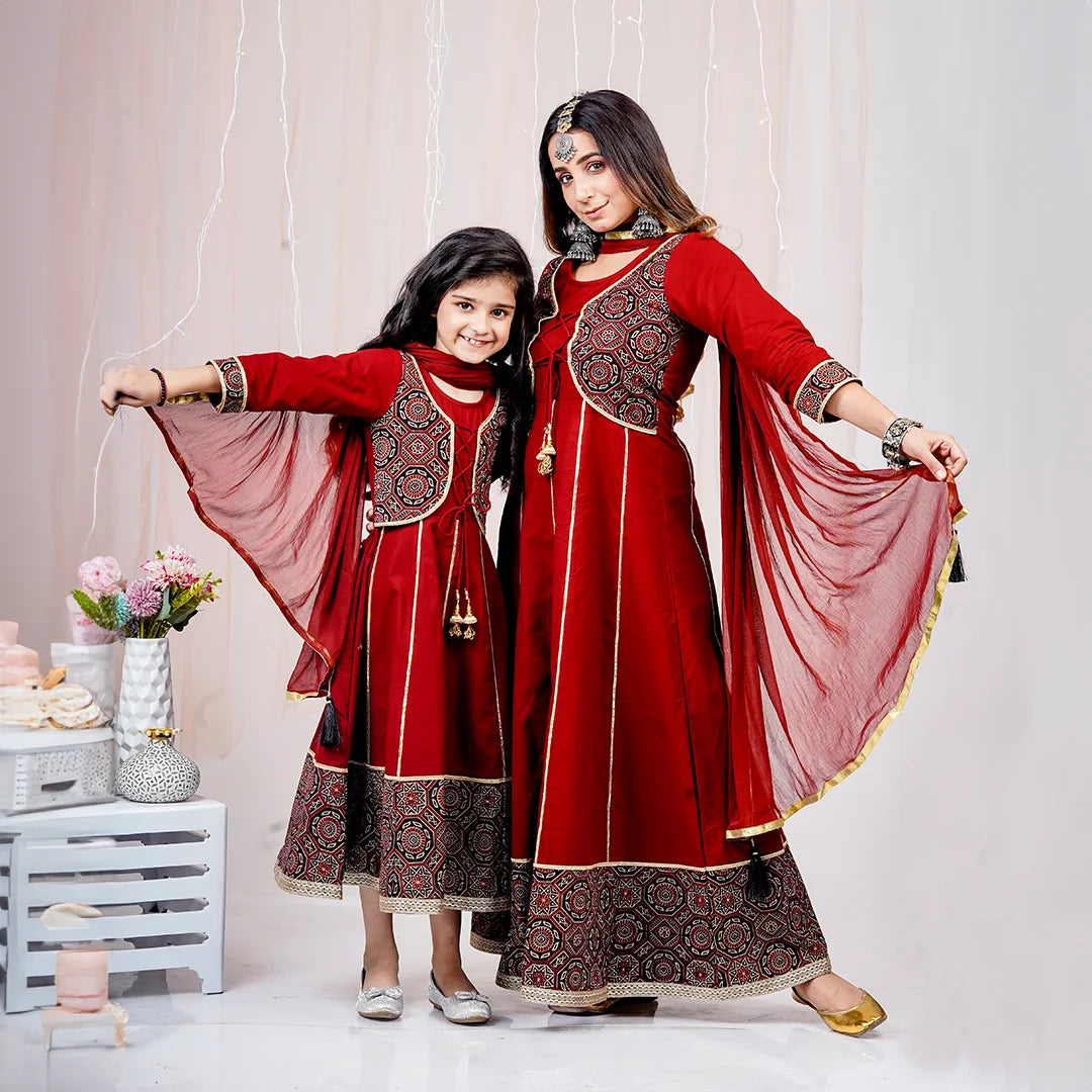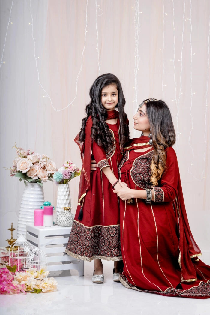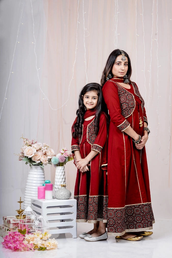 Maroon and Black Printed Anarkali Ethnic Mom and Daughter Matching Gowns