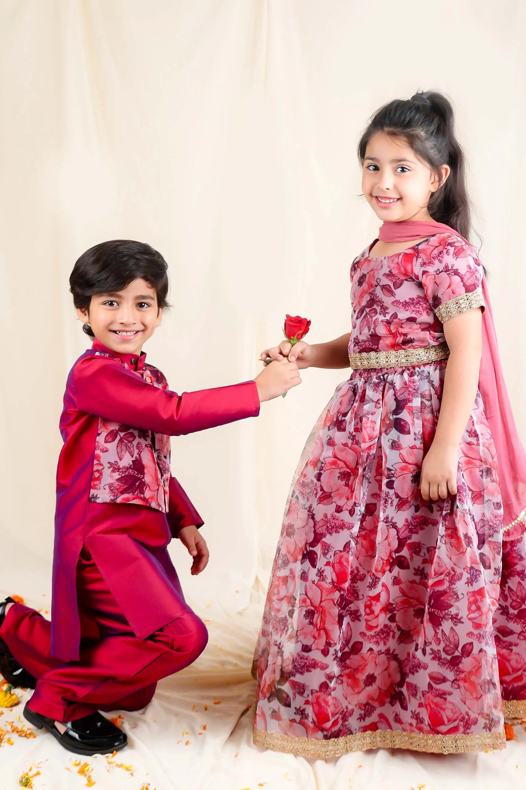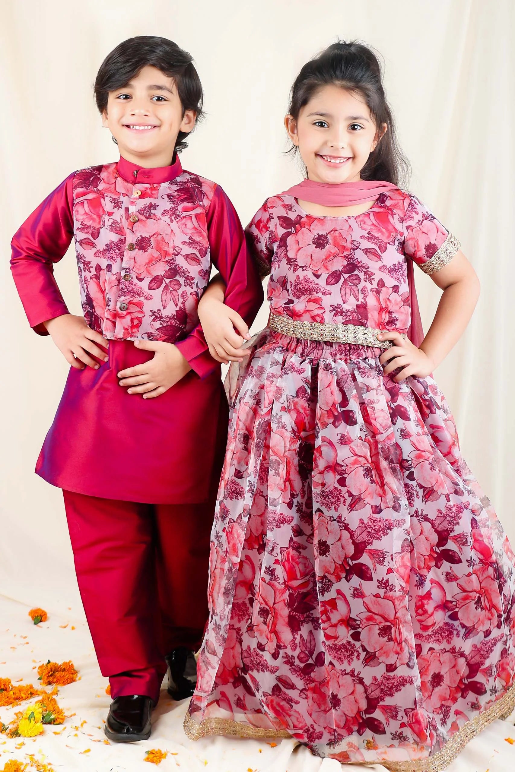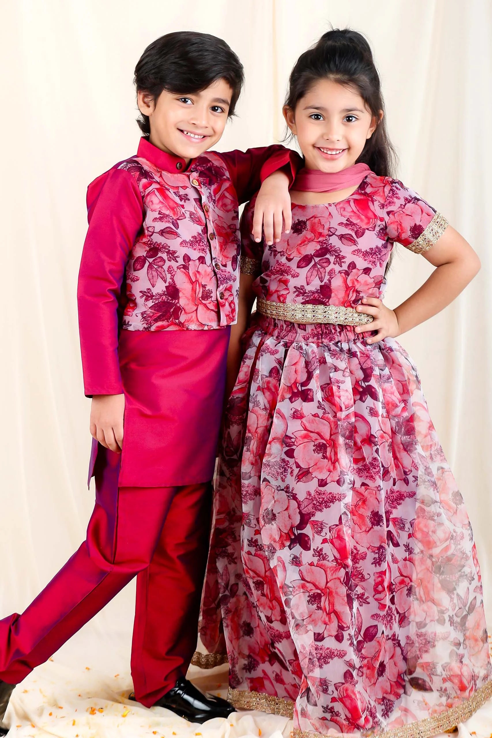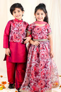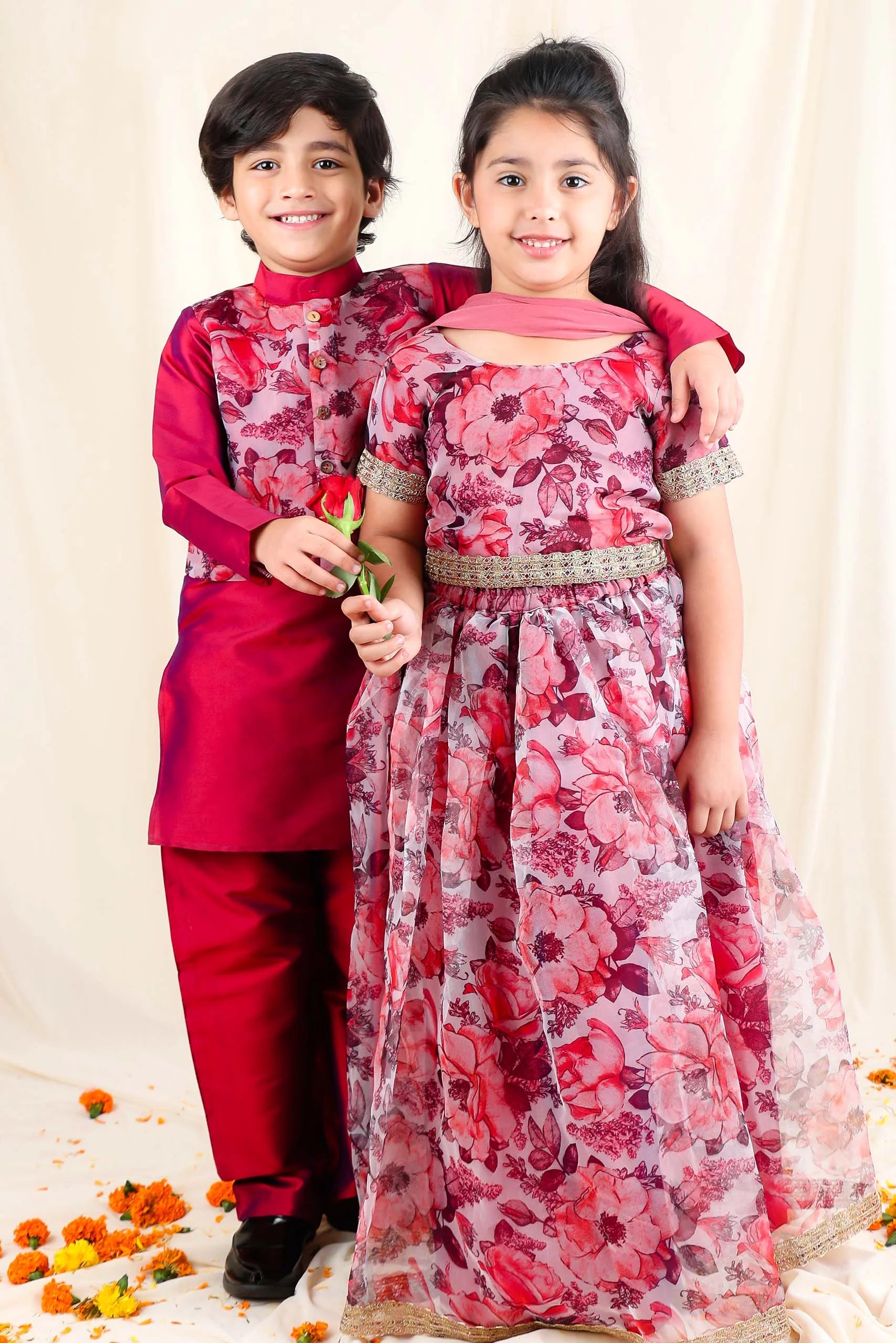 Maroon Floral Organza Matching Lehenga Choli and Kurta Pajama for Brother and Sister