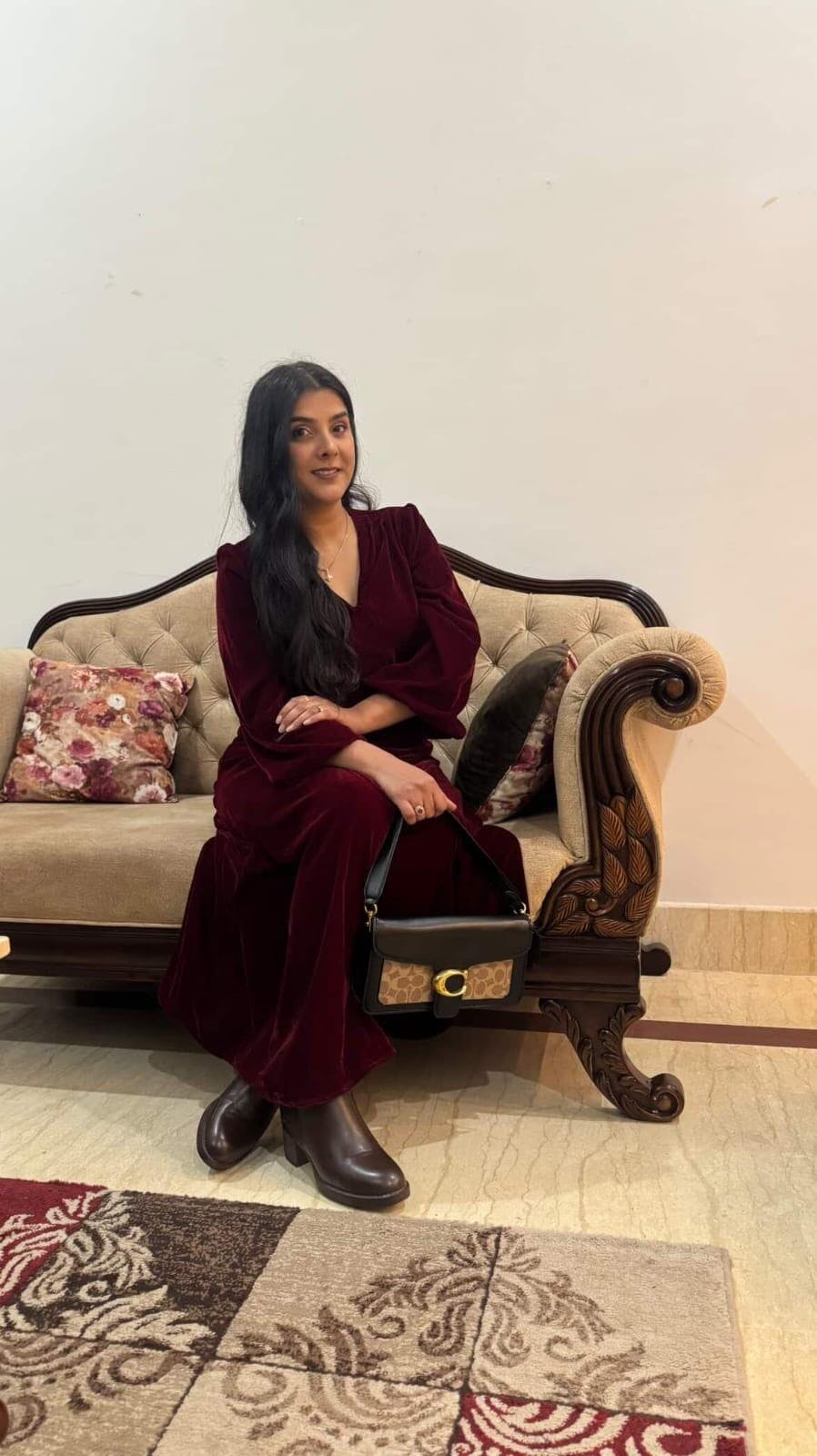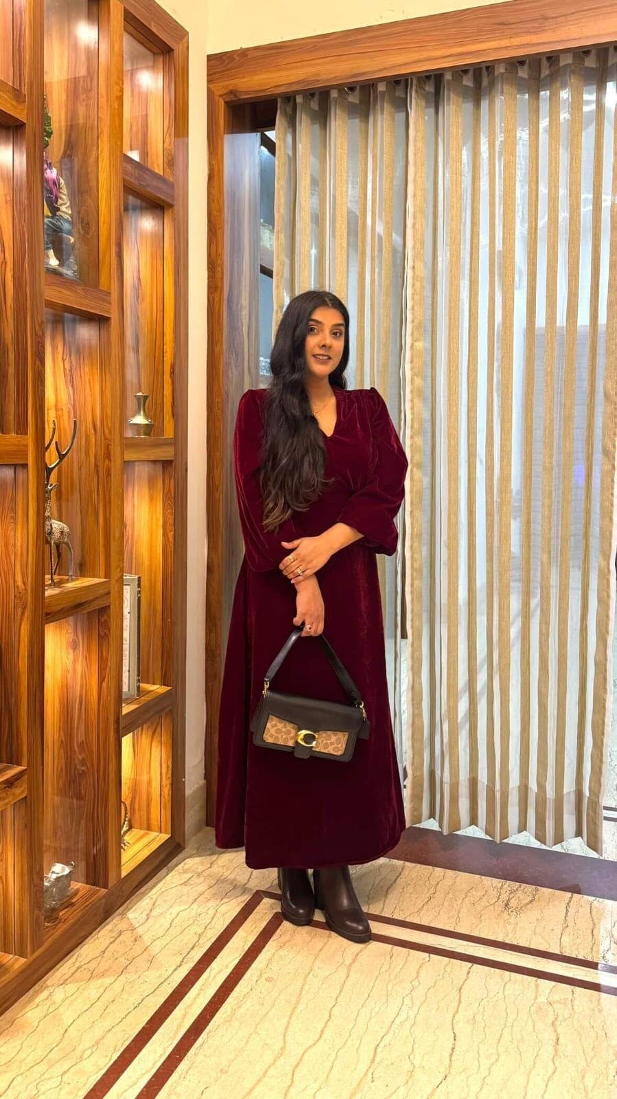 Maroon Velvet Evening Dress with Long Sleeves
