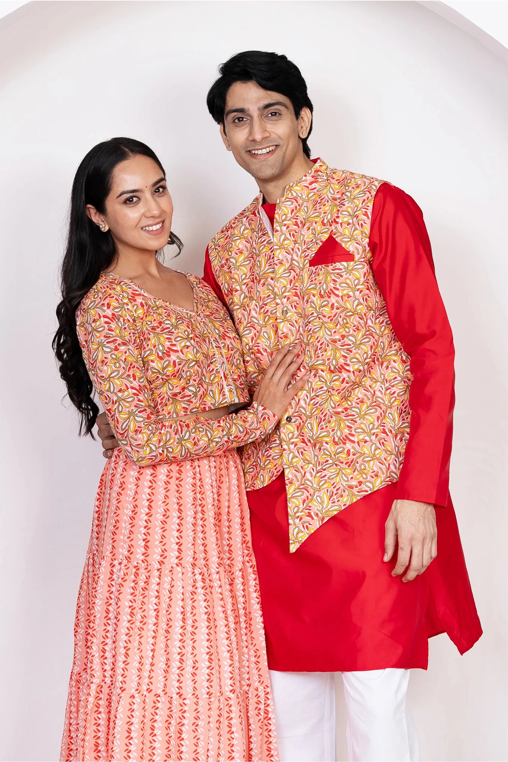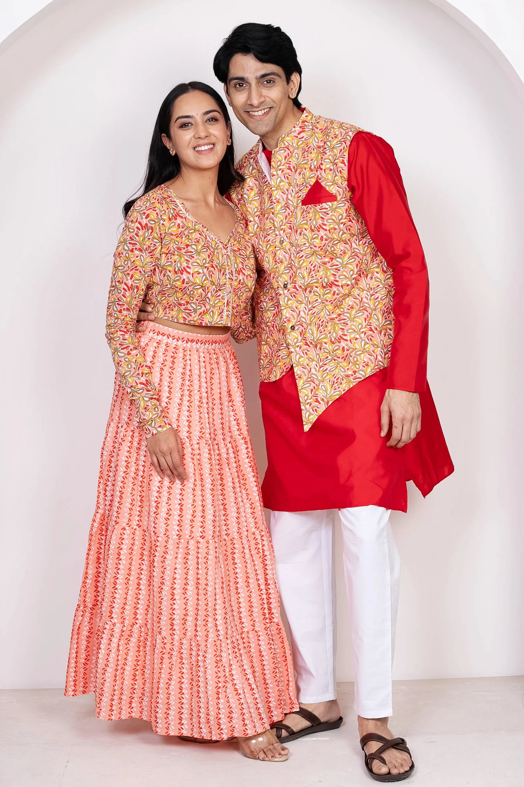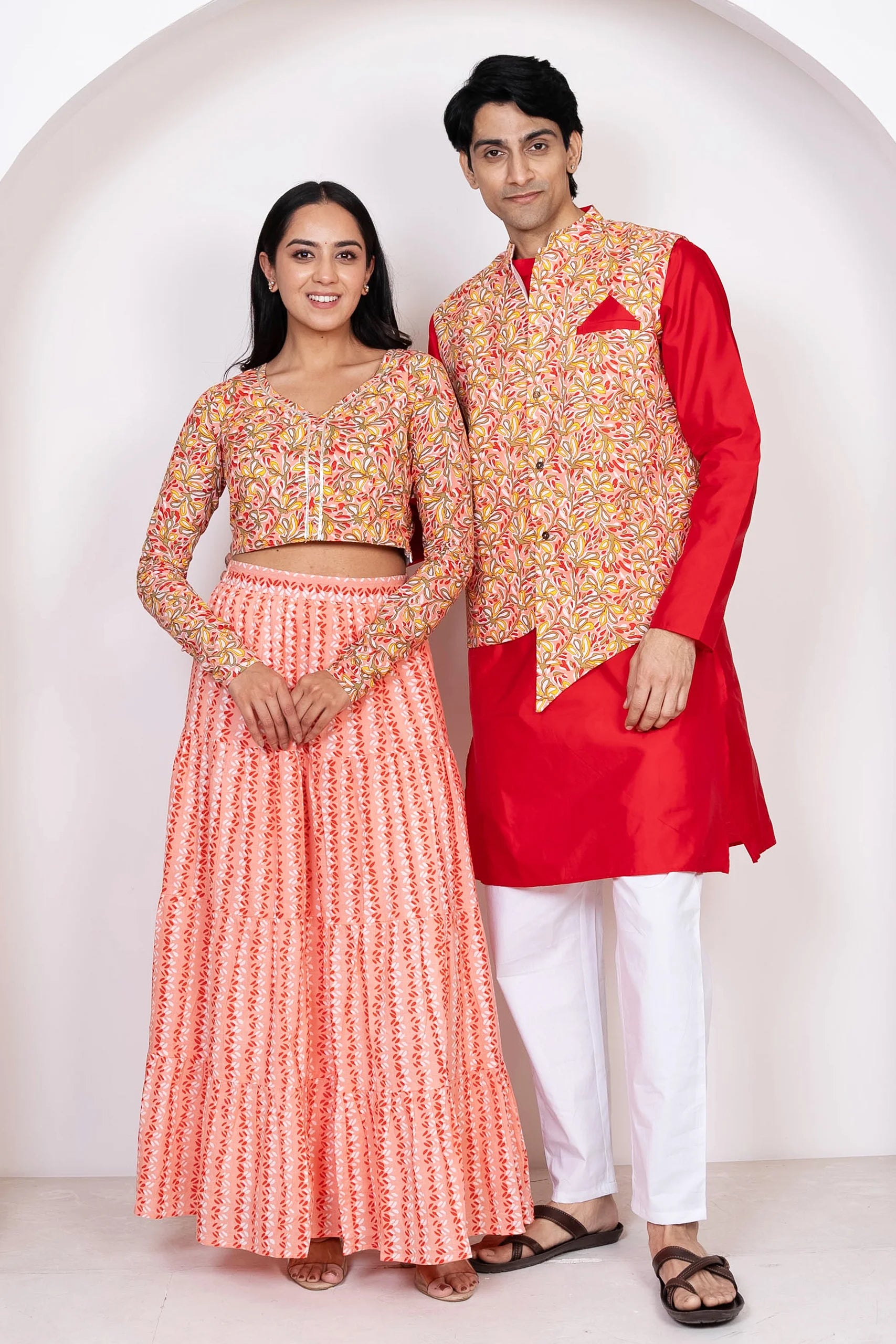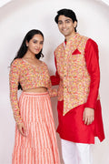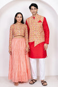 Red With Peach Floral Printed Lehenga Crop Top and Dupatta With Matching Kurta Pyjama Couple Twin Set