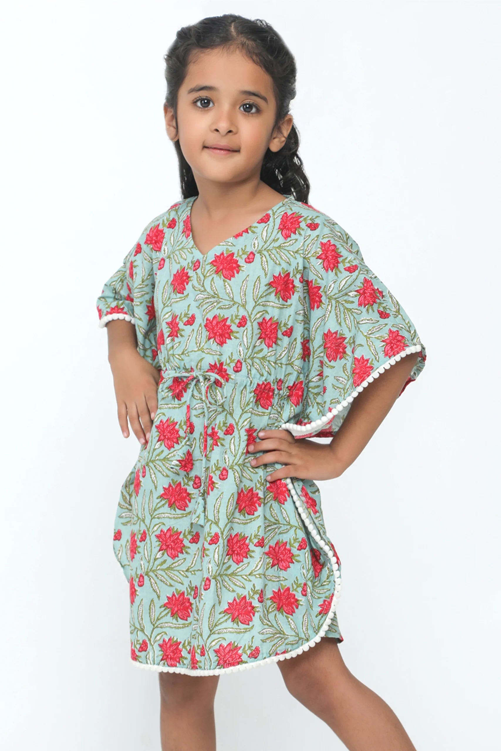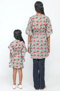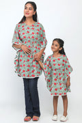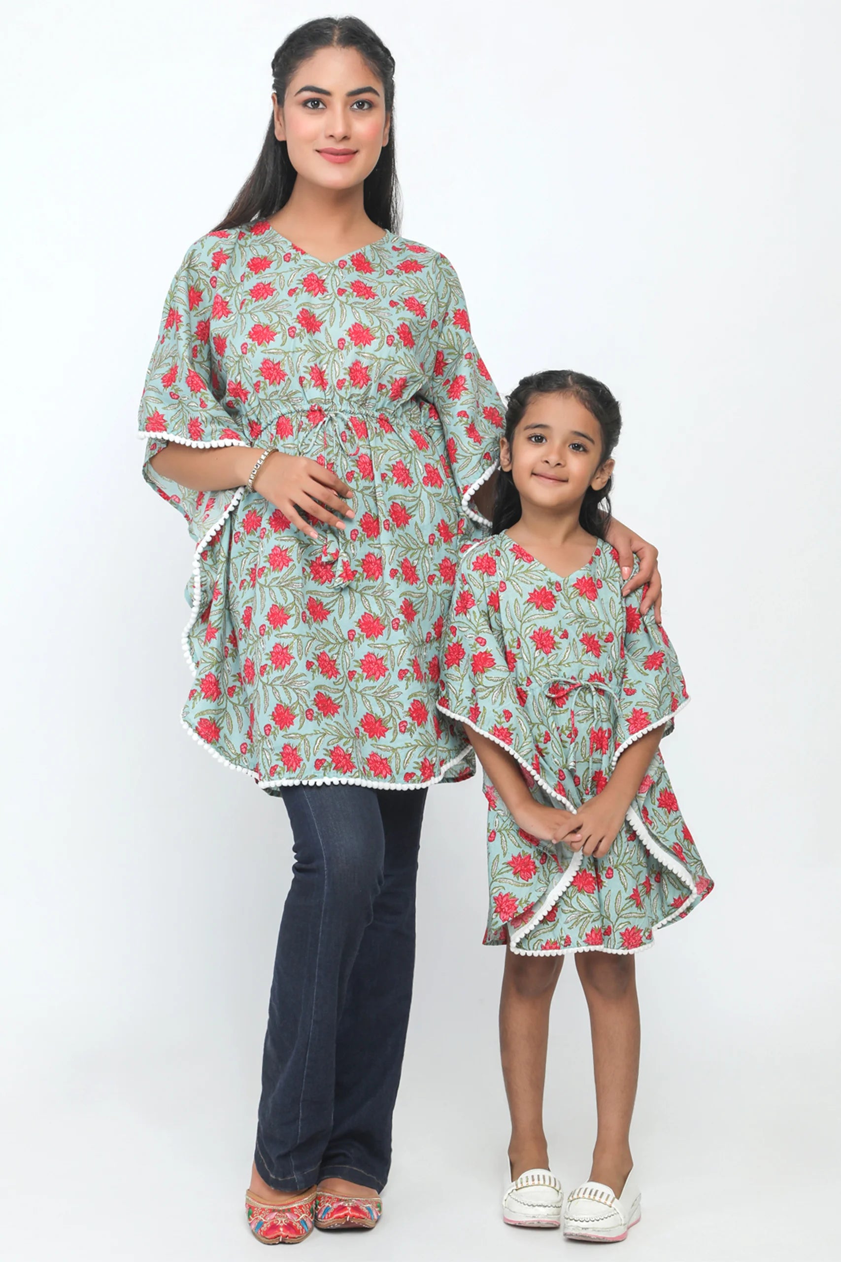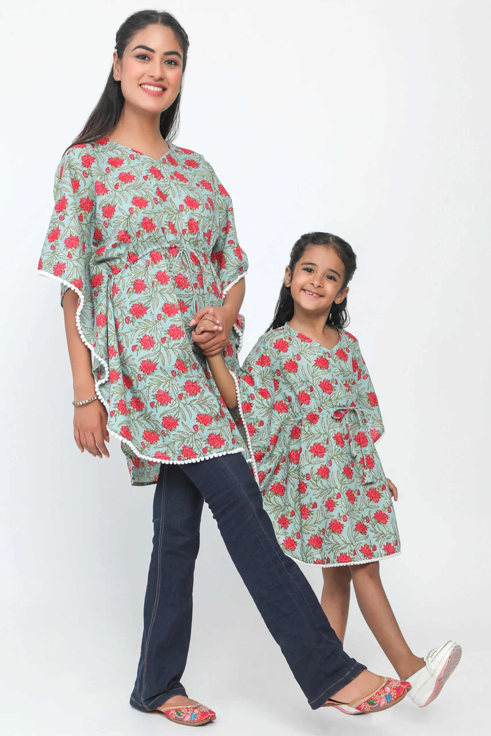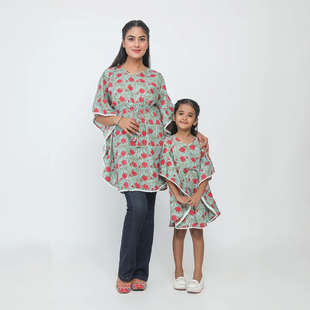 Mom and Daughter Green And Red Printed Matching Kaftan